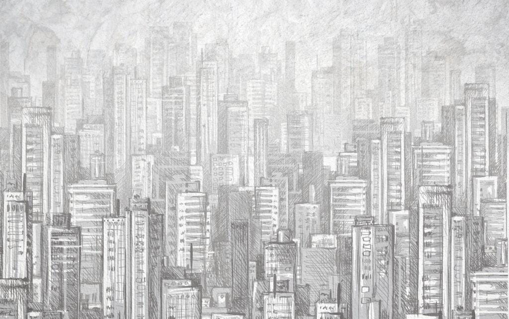 3D Pencil Drawing Wallpaper with High Building View, Black and White Peel and Stick Wallpaper, Stylish Room Design, Abstract Wallpaper