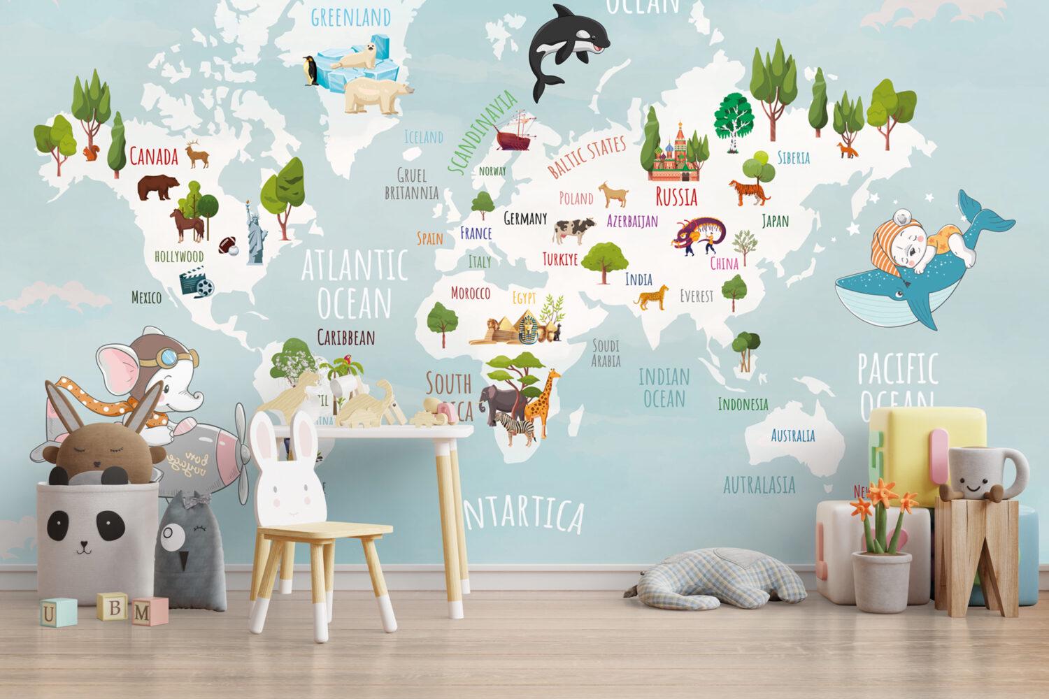 3D Wallpaper with Children's Map with Animals on Turquoise Background, Children Wallpaper , Peel and Stick Wallpaper Nursery, Baby Wallpaper