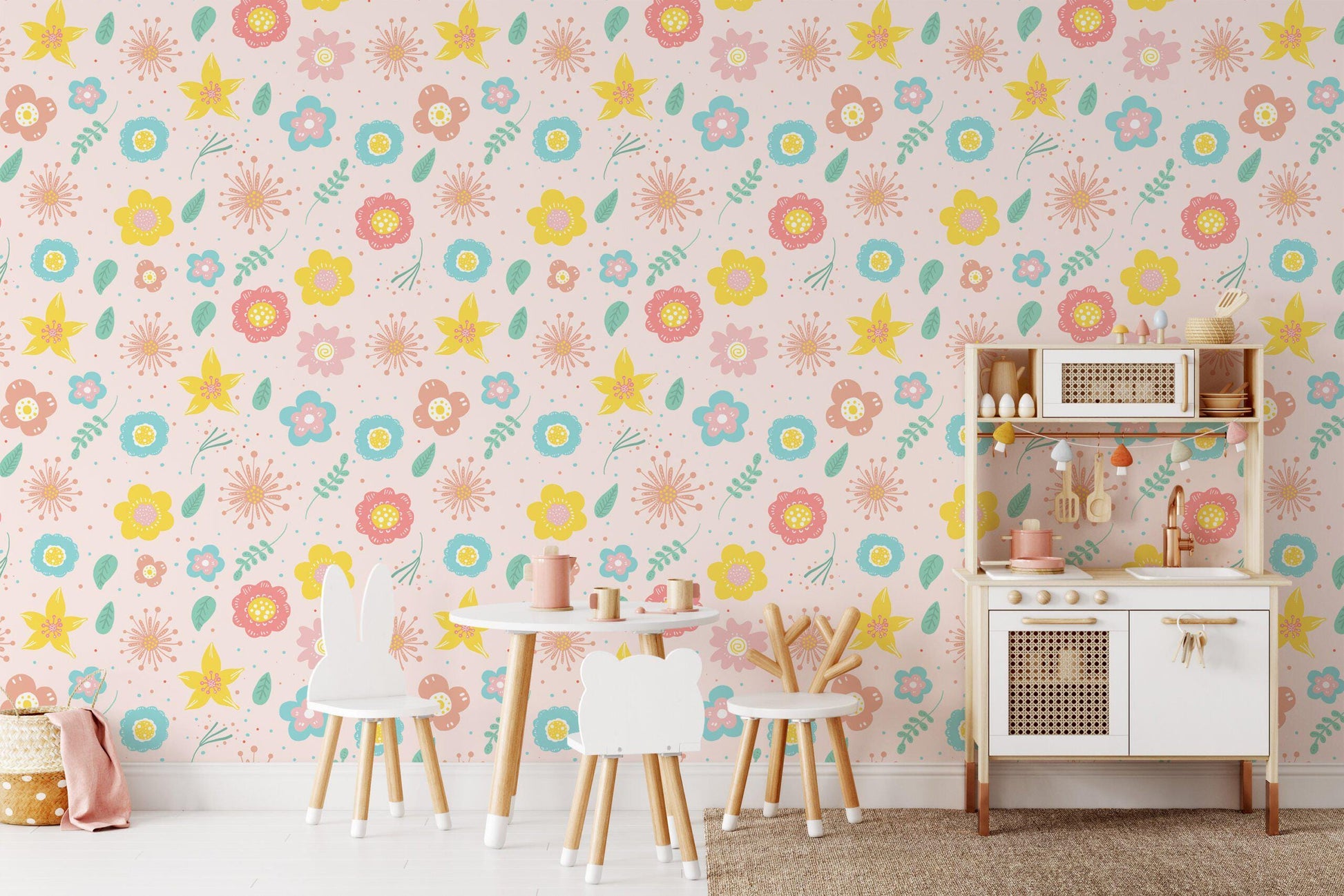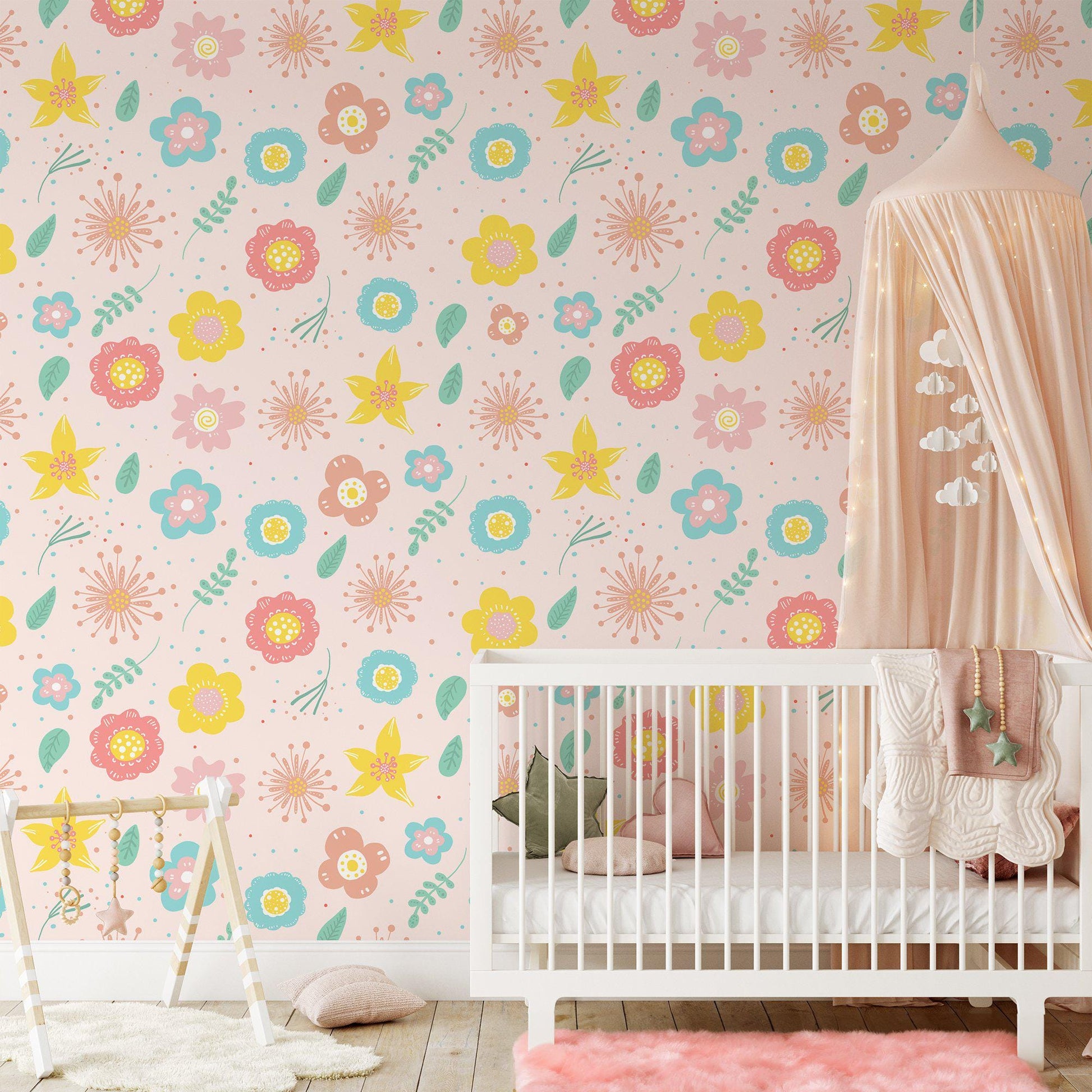 Abstract Colorful Flowers Baby Girl Wallpaper, Floral Kidsroom Wall Poster, Mini Flowers Wallpaper,Illustration Watercolor Wallpaper Nursery