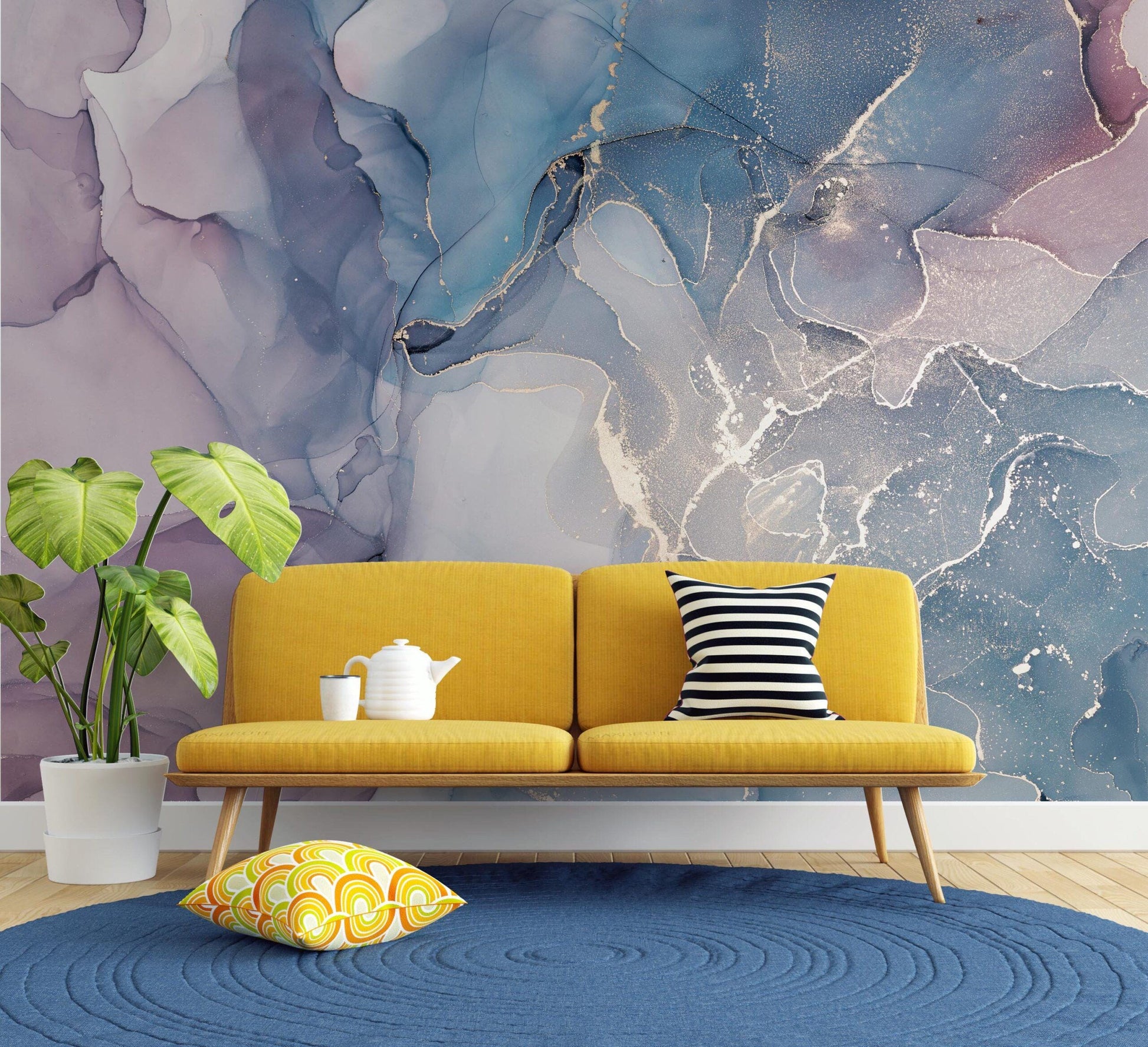 Abstract Marble Texture Acrylic Paints Wallpaper, Wallpaper in Blue and Purple Tones, Stylish Room Design, Modern Wallpaper, Cool Mural