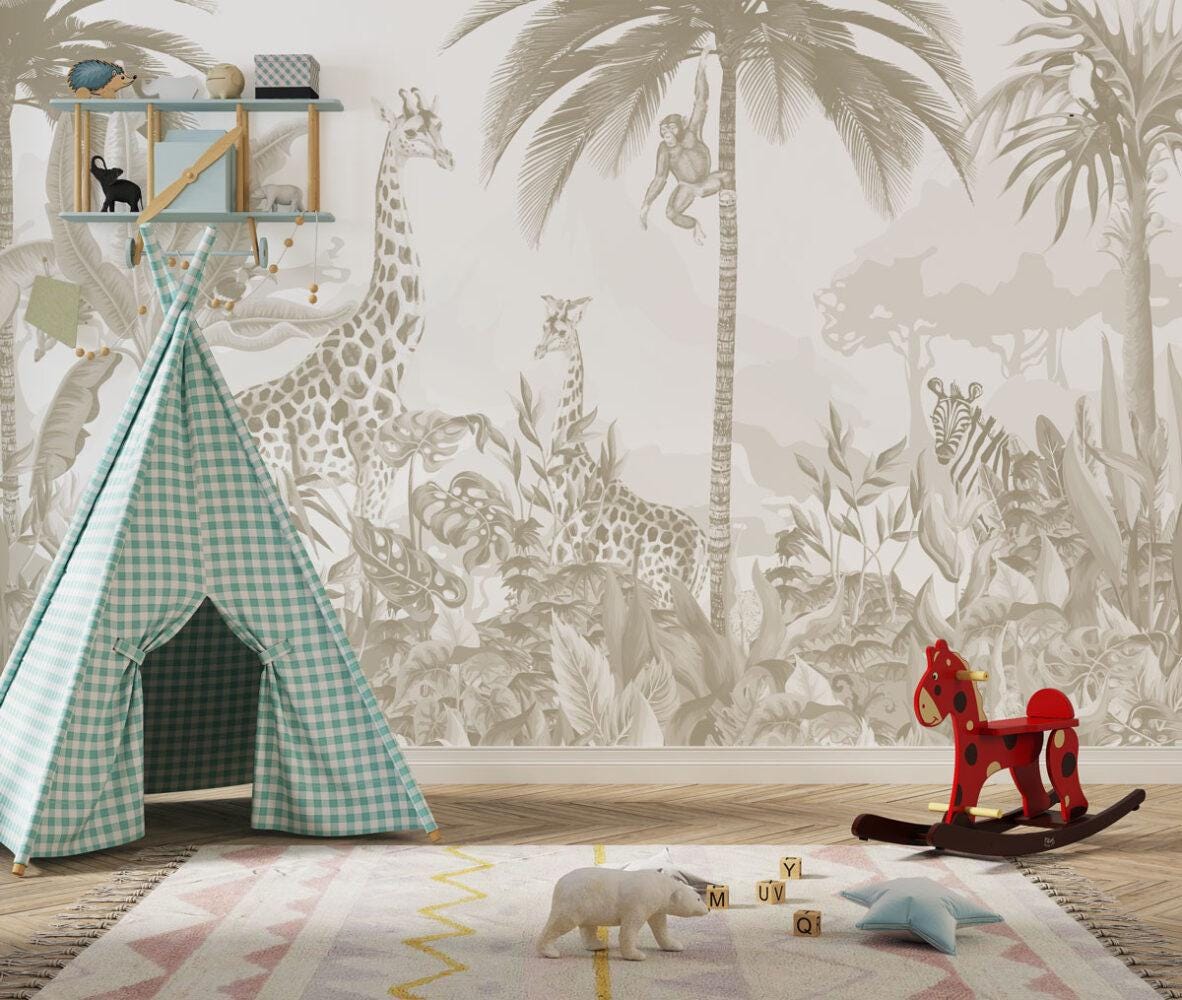 Animals and Tropical Tree in the Bright Tone Jungle Wallpaper, Illustration Safari Kids Wallpaper, Giraffe Wallpaper Nursery, Baby Wallpaper