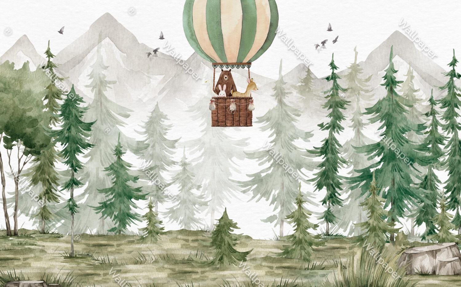 Animals in Balloons in the Forest with Watercolor Effect Wallpaper For Kidsroom, Trees Wallpaper Nursery , Baby Peel and Stick Wall Mural