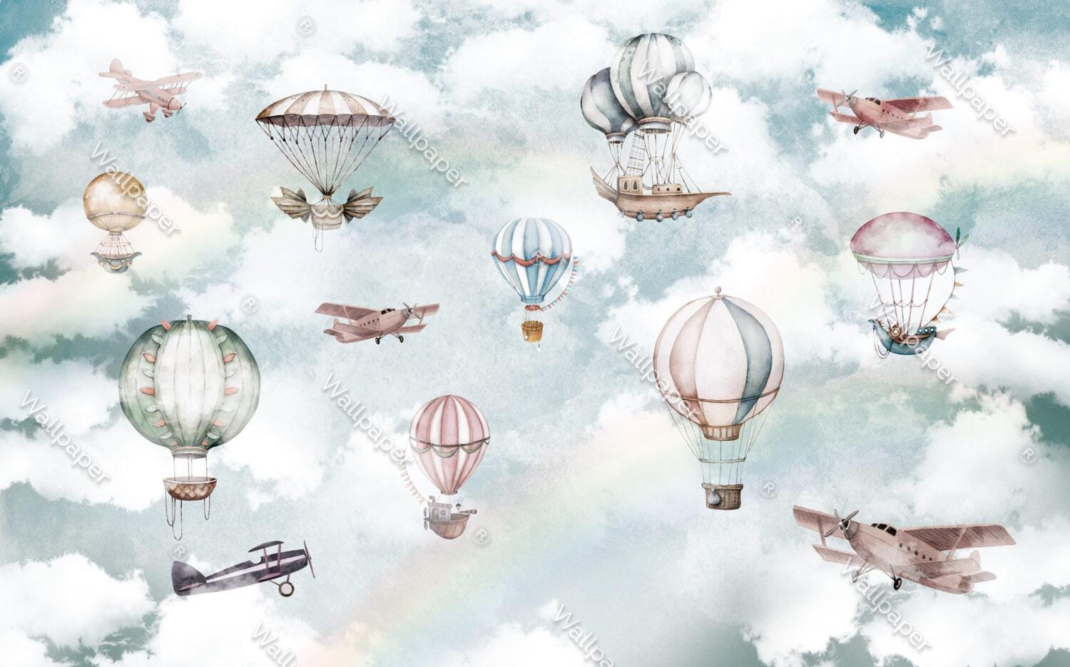 Balloons Flying in the Sky Wallpaper For Kidsroom, Cute Animals Wallpaper Nursery, Soft Childrens Wallpaper , Peel and Stick Baby Wallpaper
