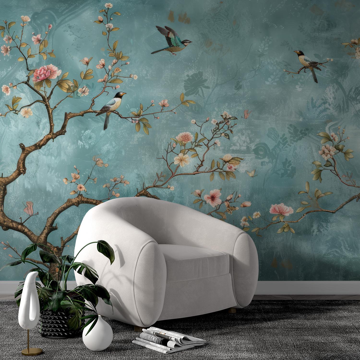 Birds and Flowers Wallpaper on Turquoise Background, Spring Flowers Wallpaper, Floral Wallpaper, Romantic Mural, Blooming Drawing Wallpaper