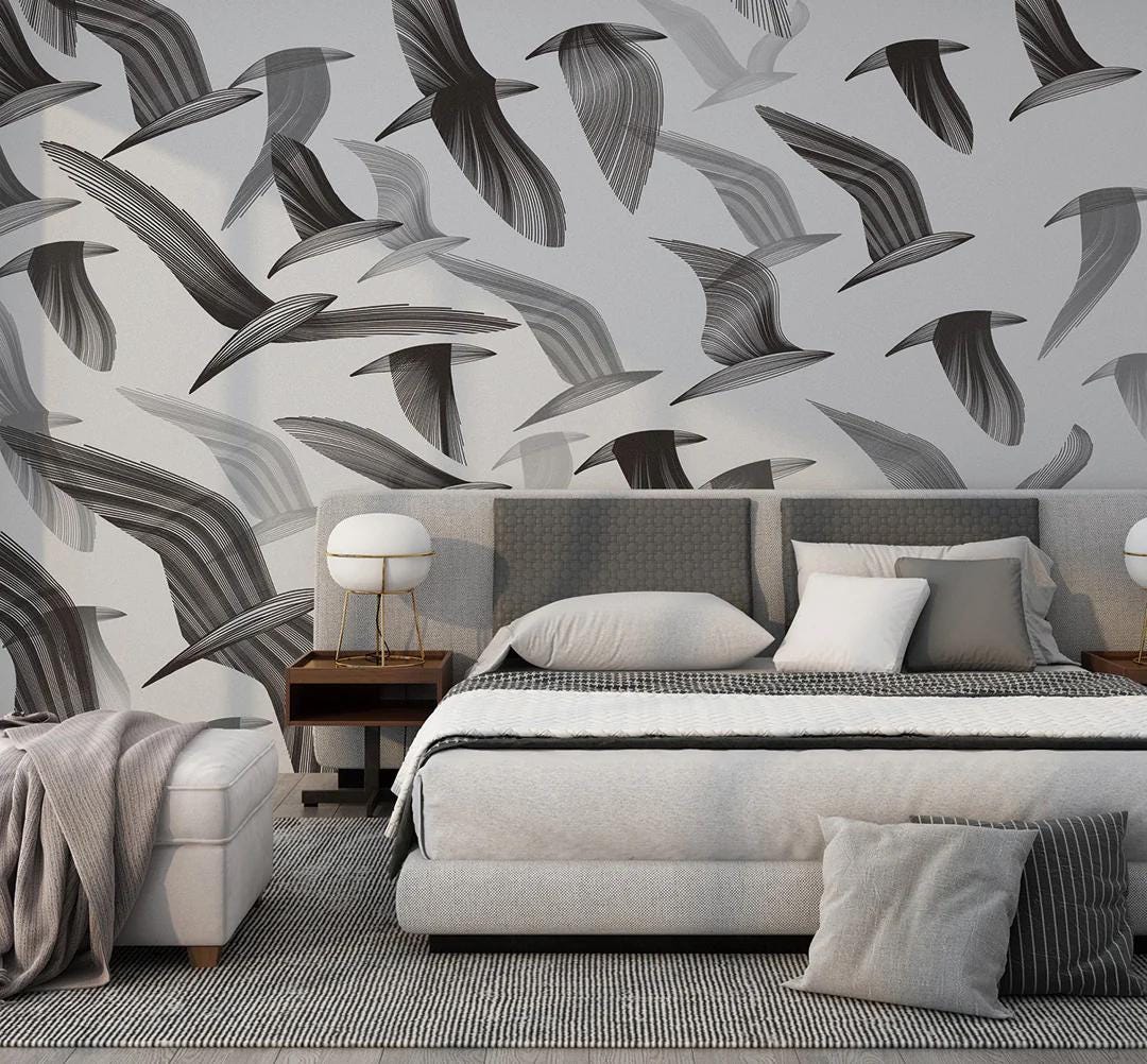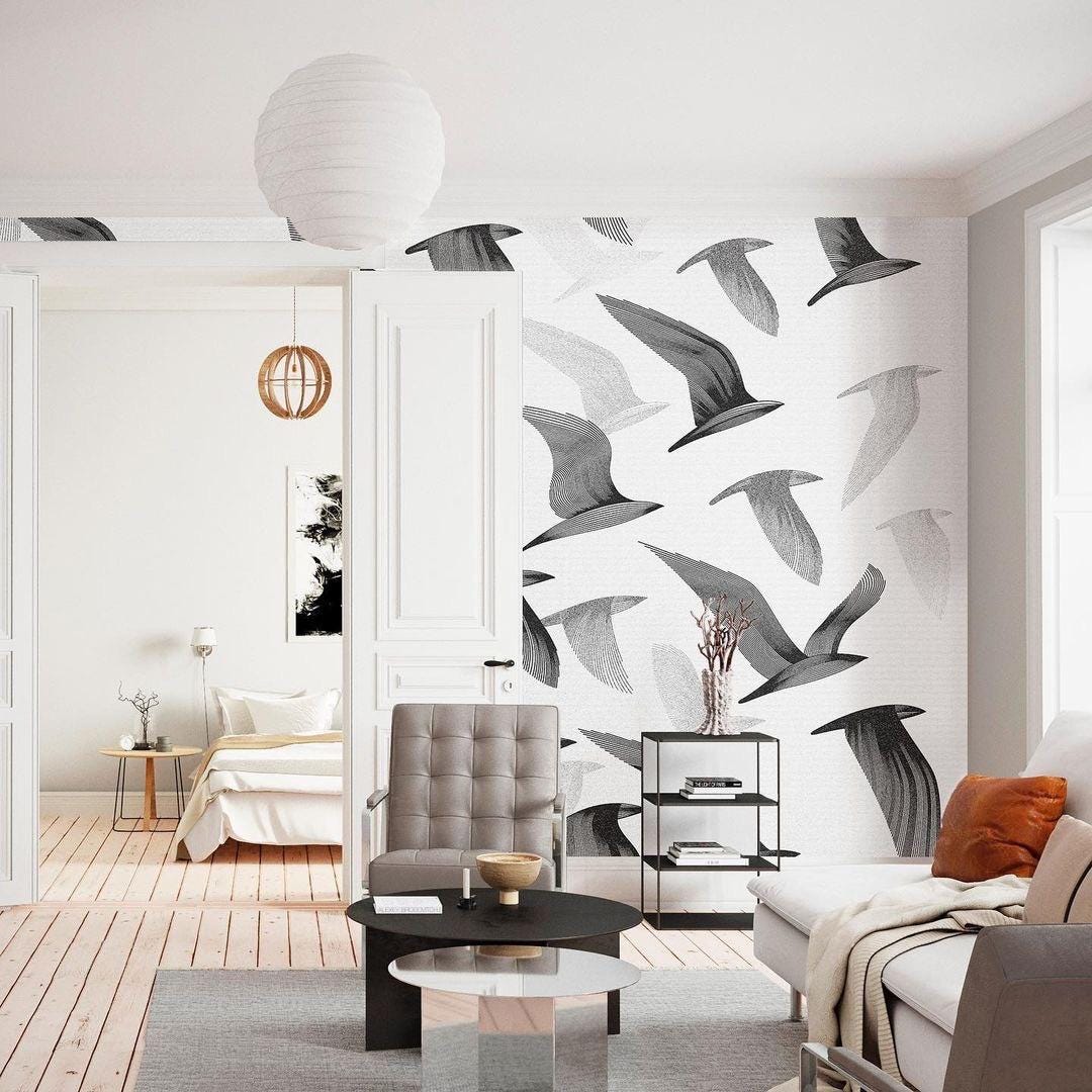 Black Birds Wallpaper, Illustration Birds Pattern Wallpaper, Bathroom Wallpaper, Drawing Wall Mural, Bedroom Wallpaper, Nature Wallpaper
