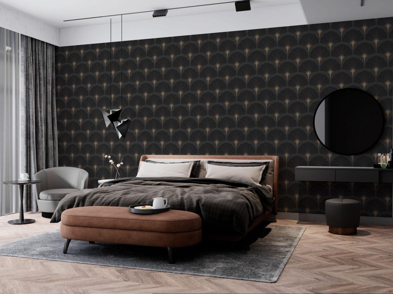Black Fan Pattern Wallpaper, Abstract Wallpaper with Vintage Pattern, Boho Style Wallpaper, Design Wallpaper, Modern Pattern Wallpaper