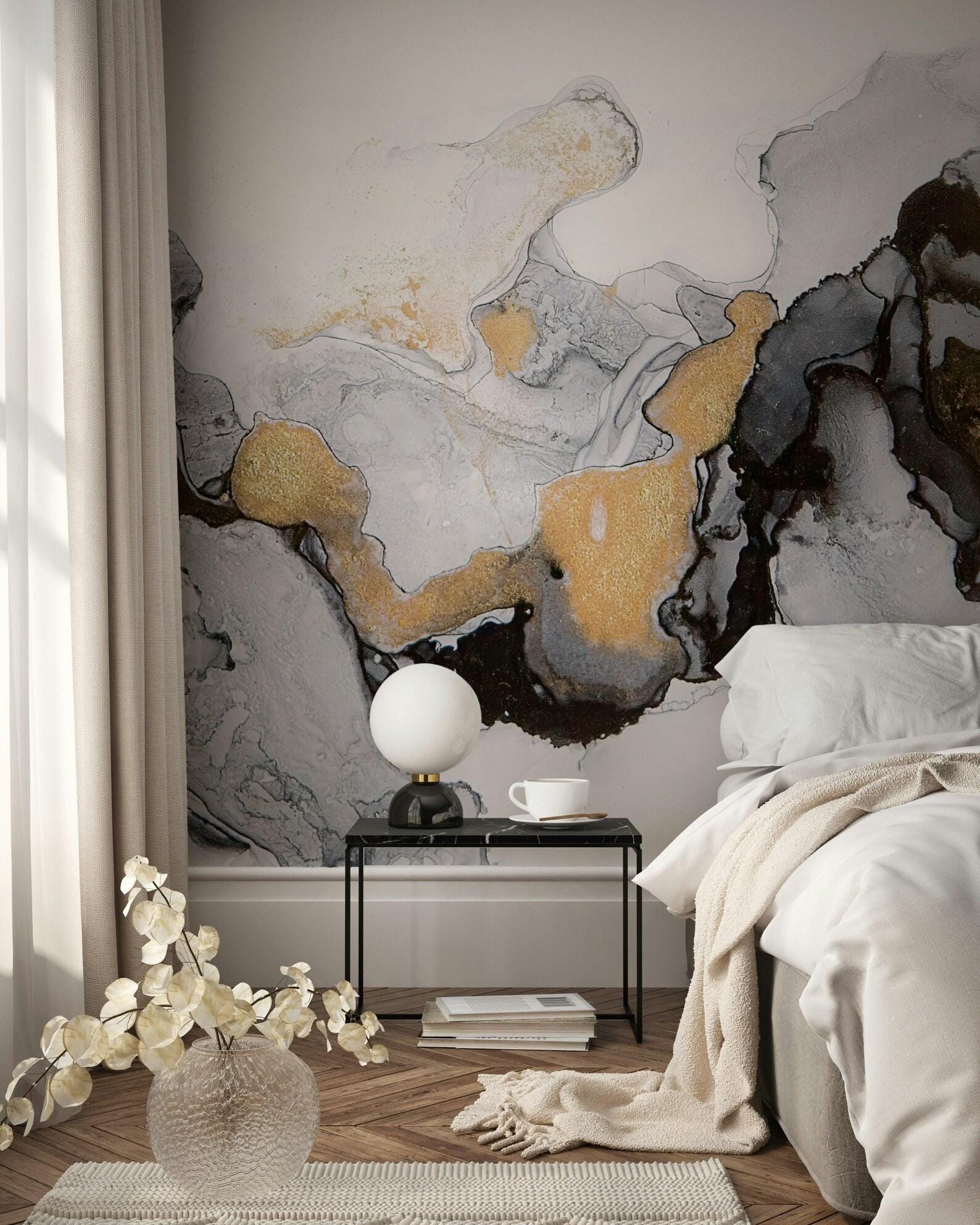 Black, Gray, White and Gold Marble Effect Wallpaper, Abstract Marble Texture Cool Mural, Stylish Wall Design, Modern Wallpaper