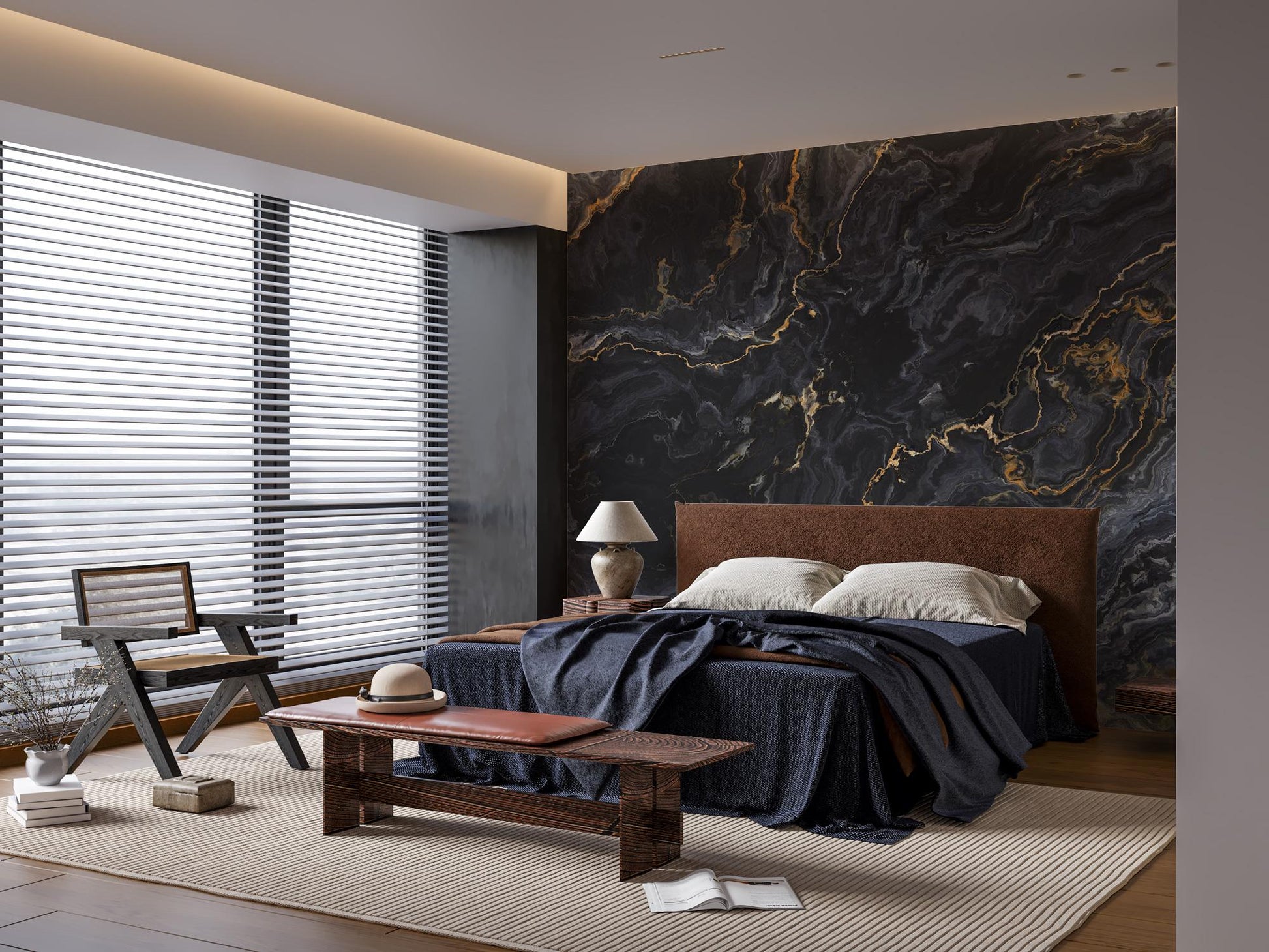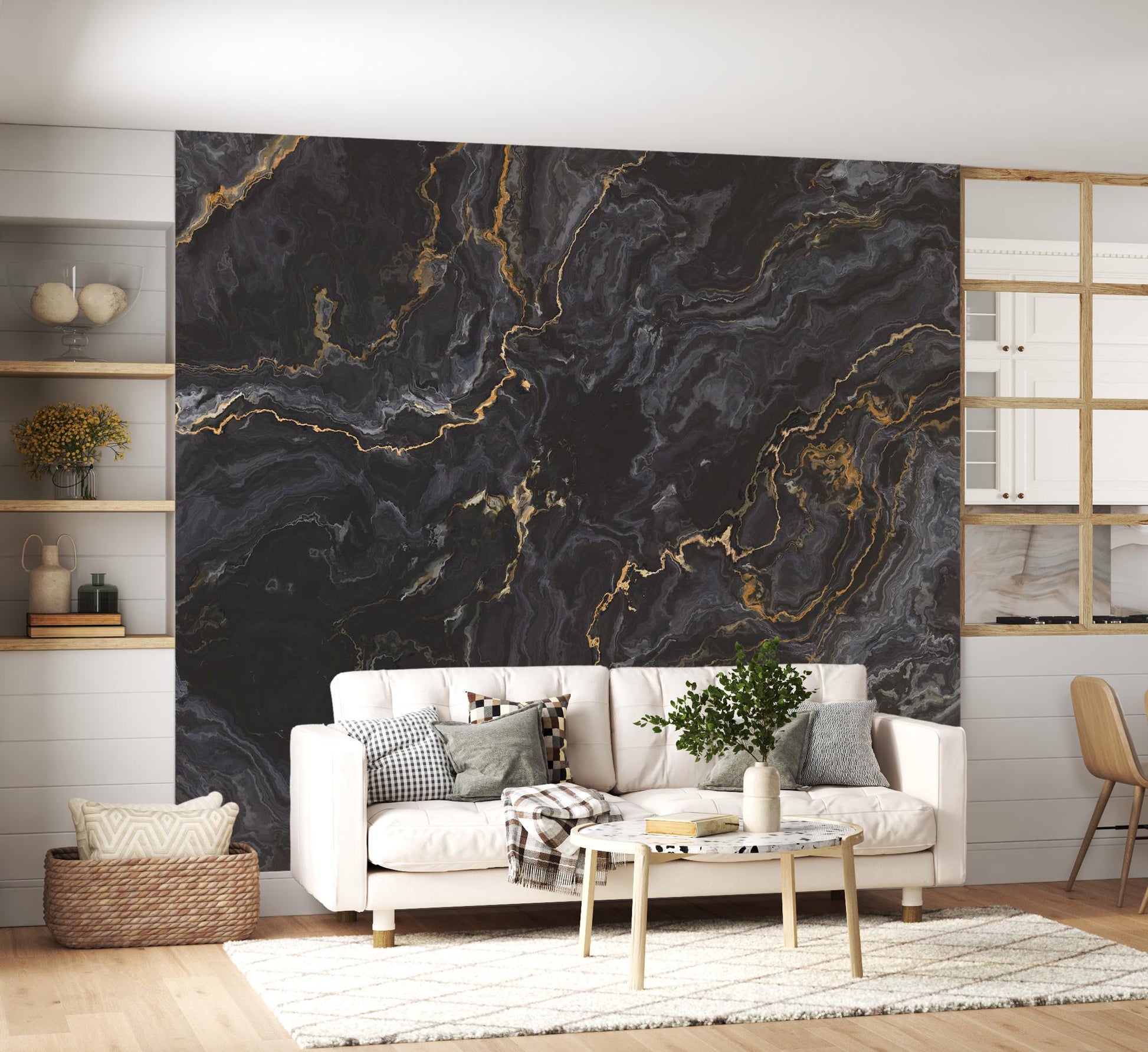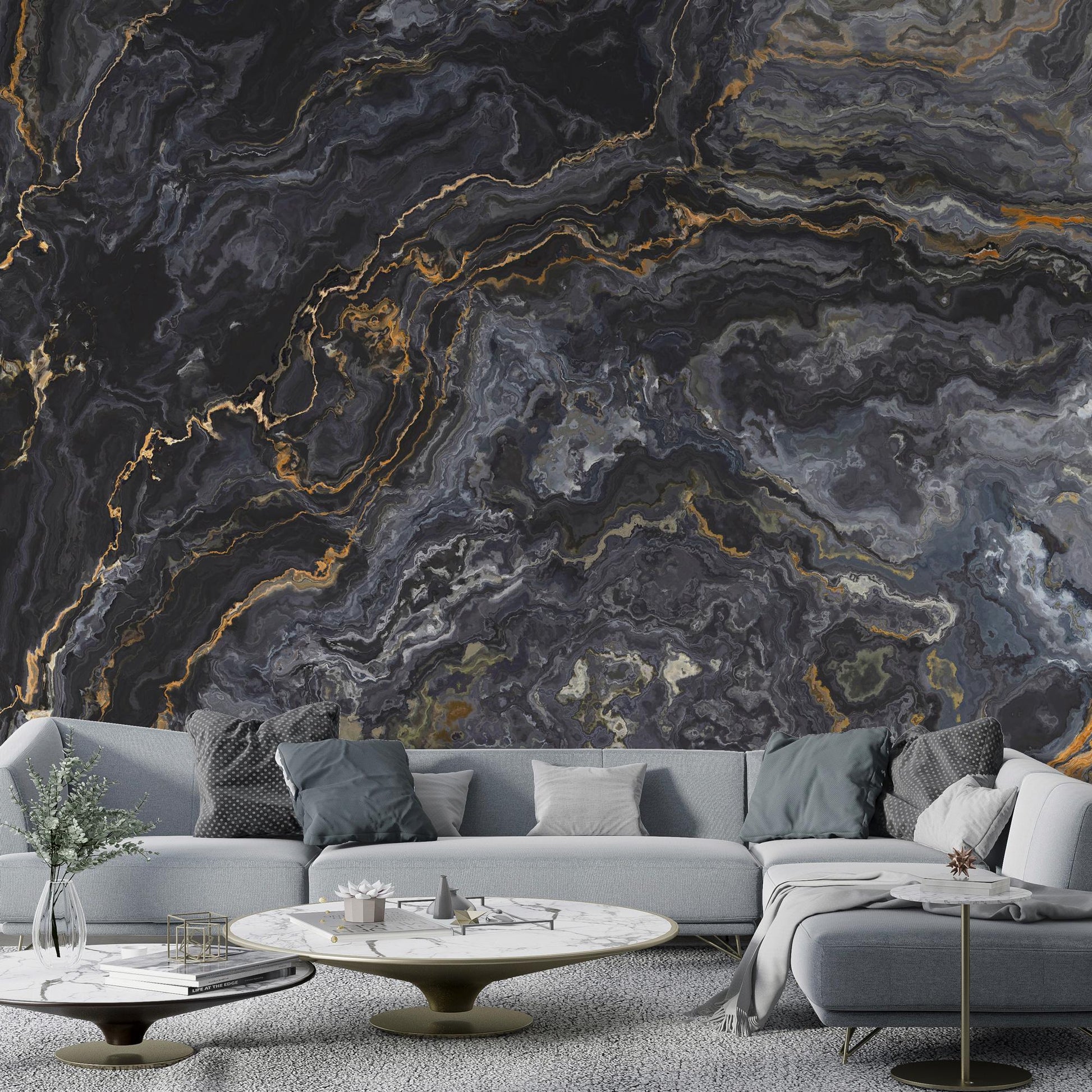 Black Marble and Gold Colored Moires Patterned Wallpaper, Design Abstract Peel and Stick Wallpaper, Modern Natural Looking Marble Wallpaper