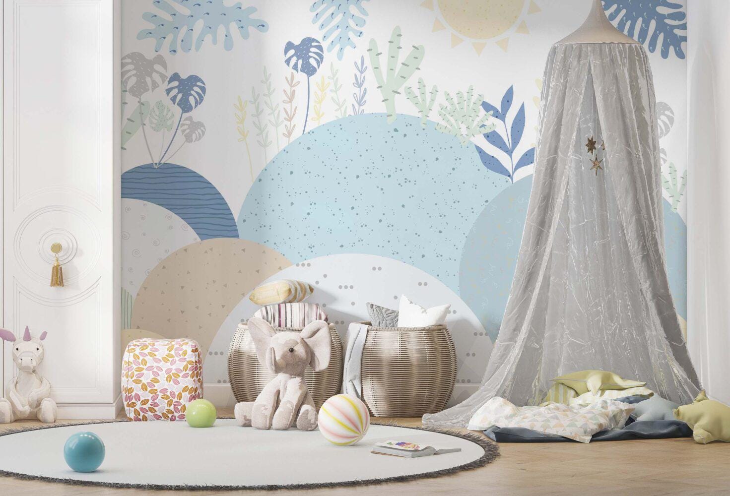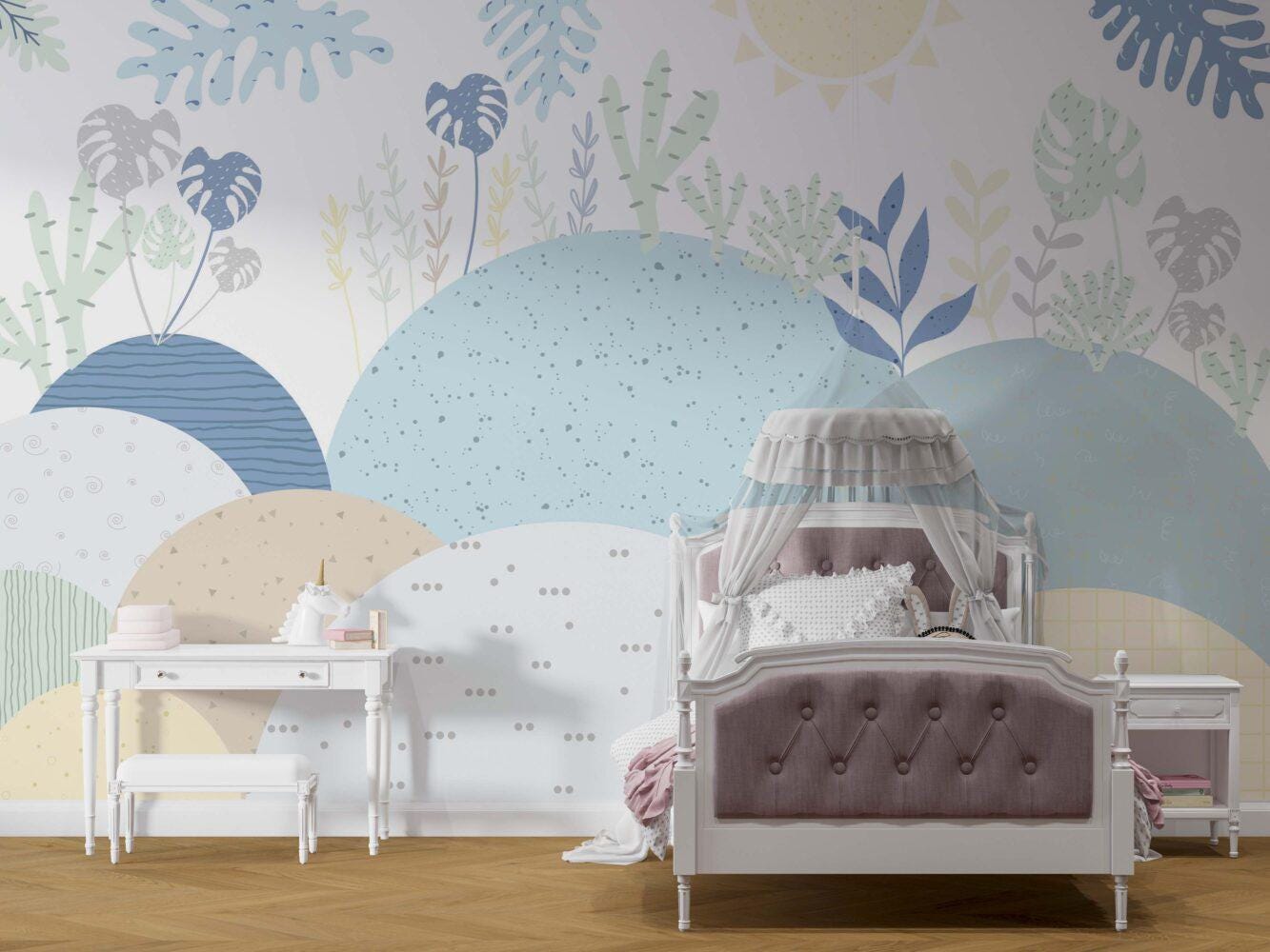 Blue Abstract Mountains and Leaves Wallpaper For Kidsroom, Wallpaper Nursery, Child Wallpaper, Peel and Stick Wallpaper, Blue Wallpaper