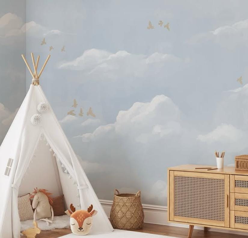 Blue Sky Wallpaper, Blue Cloud Wall Poster, Soft Blue Background Baby Room Wallpaper, Illustration Wallpaper Nursery, Baby Boy Wall Mural