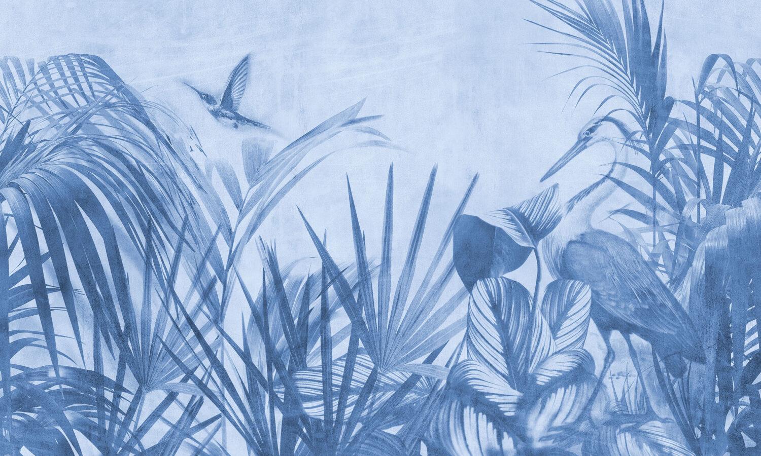 Blue Tone Tropical and Bird Wallpaper, 3D Wallpaper, Exotic Plant Floral Wallpaper, Palm Leaves Bohemian Wallpaper, Botany Wallpaper