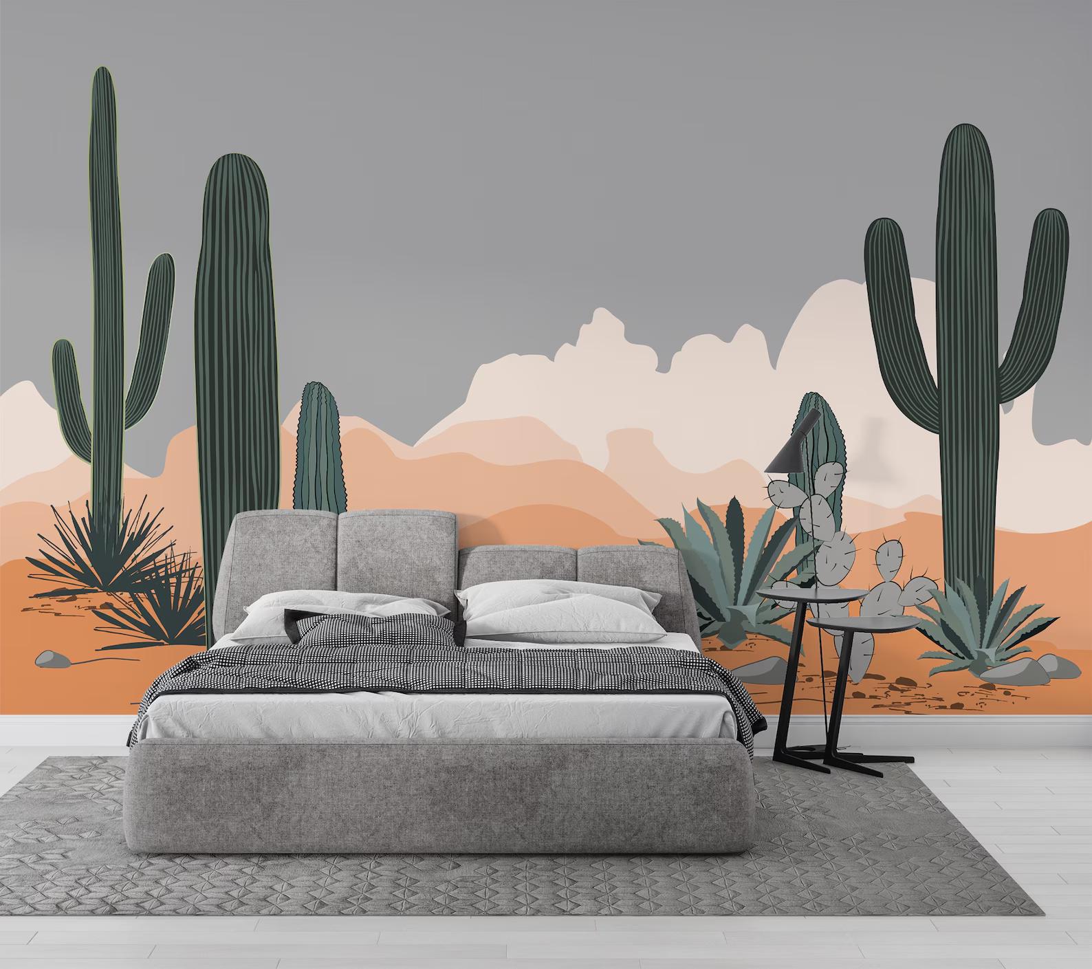 Cactuses in the Desert Wallpaper, Desert Sunset Illustration Wallpaper, Cactus Garden Wallpaper, Modern Abstract Pattern Wallpaper