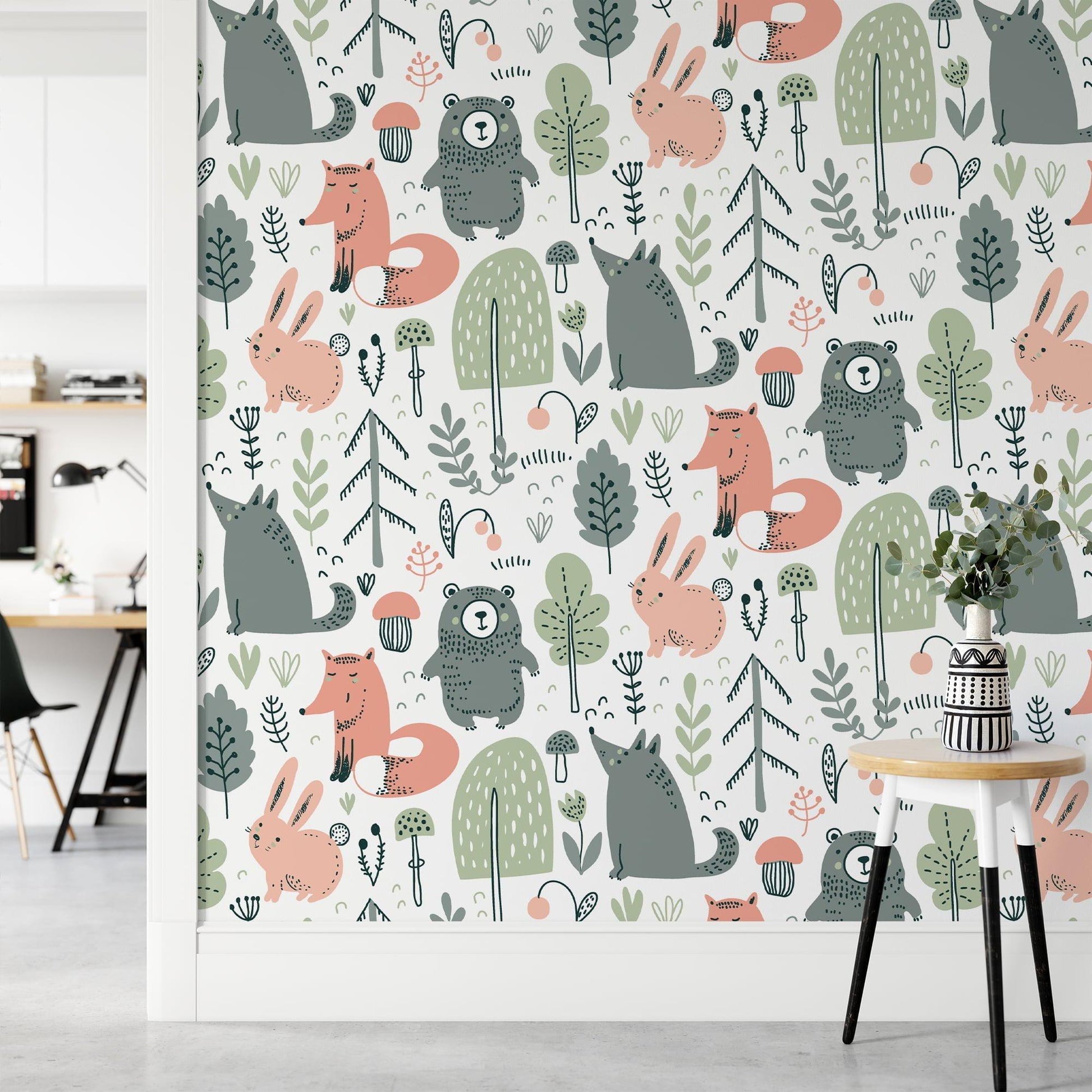 Children's Wallpaper with Fairytale Forest Animals Drawings, Cute Bear and Fox 3D Kids Wall Poster, Cute Baby Wallpaper, Wallpaper Nursery