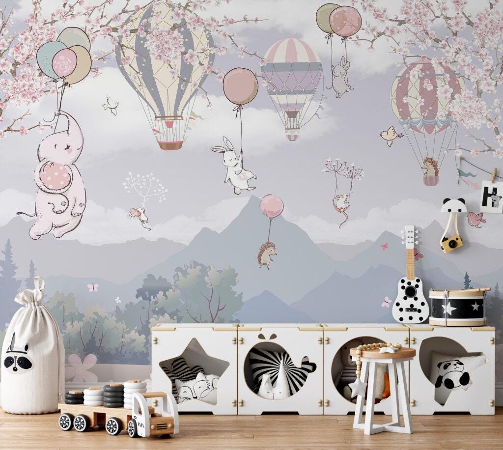 Cute Animals Flying in Balloons and Mountain Pattern Child Wallpaper, Watercolor Wallpaper Nursery, Rabbit Elephant Hedgehog Mouse Wallpaper