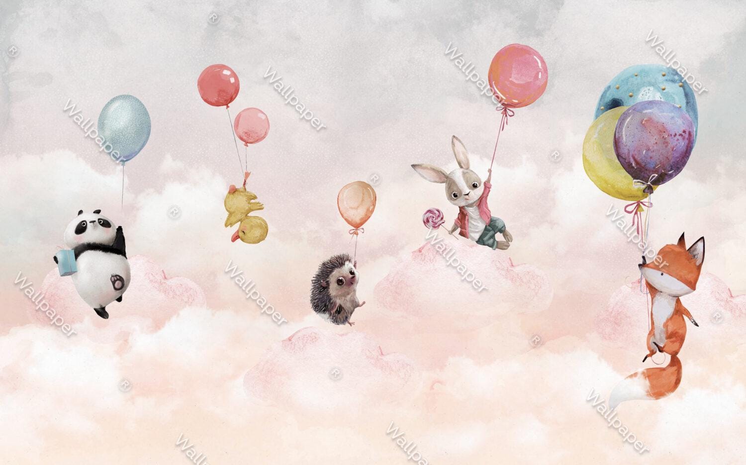 Cute Animals Holding on Balloons Wallpaper For Kidsroom, Cute Animals Wallpaper Nursery, Childrens Wallpaper , Peel and Stick Baby Wallpaper