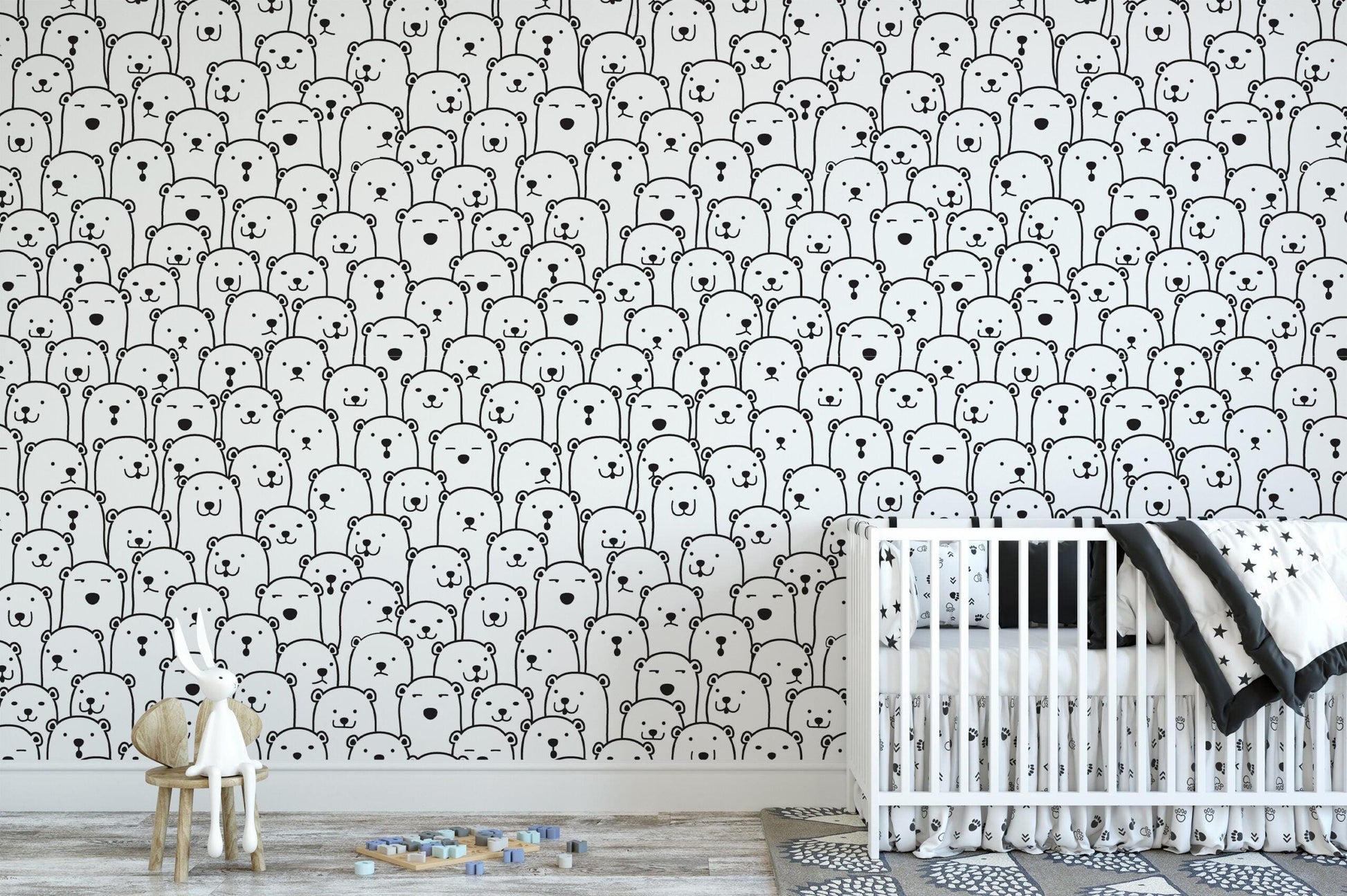 Cute Crowded Bears Line Art Pattern Kids Wallpaper, Cute Baby Room Sketch Wallpaper, Kids Room Wall Poster, Drawwing Wallpaper Nursery