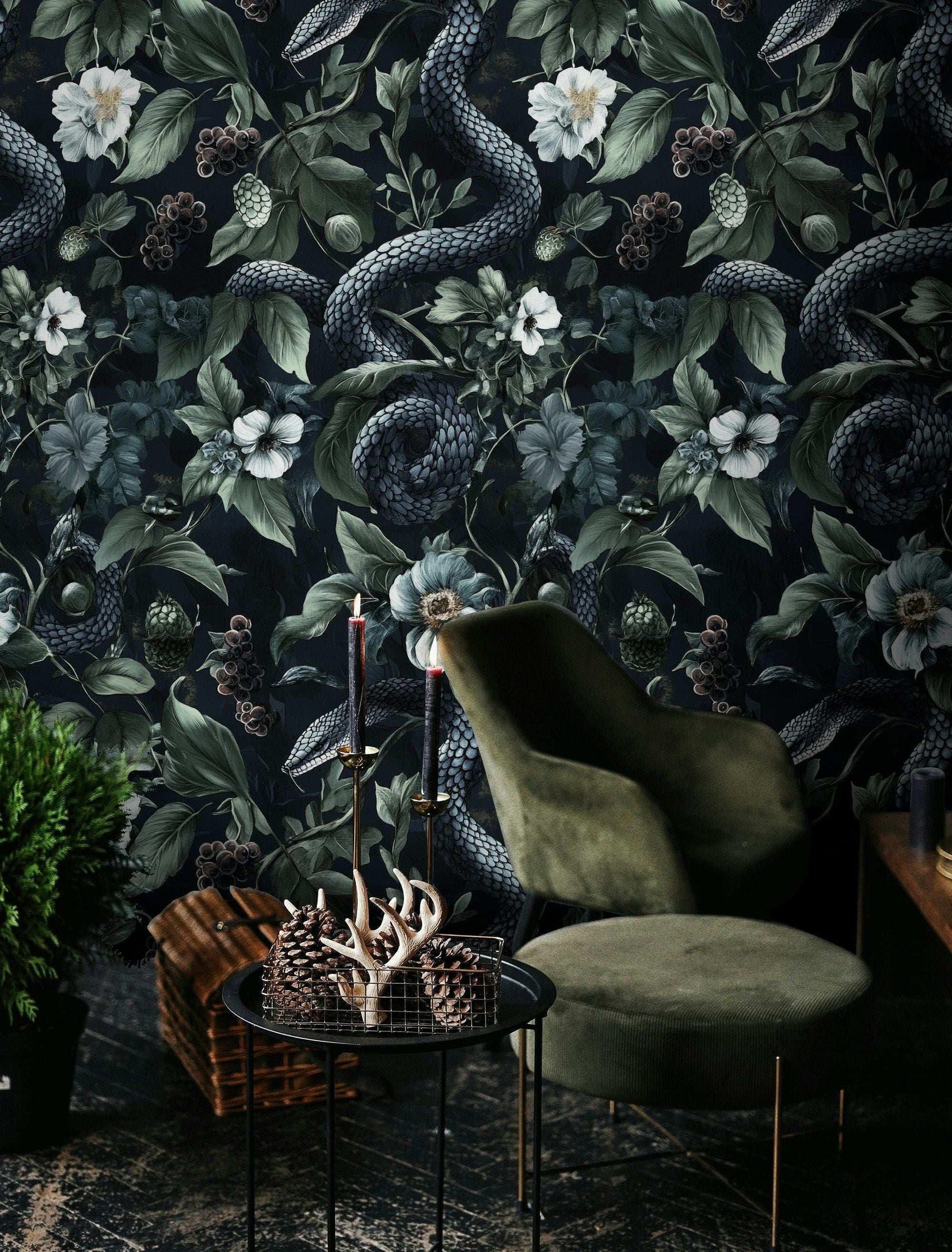Dark Botanical wallpaper Secret Garden at Night, Snakes and Flowers, Exotic Plants, Black background Wallpaper, Leather Look Wallpaper