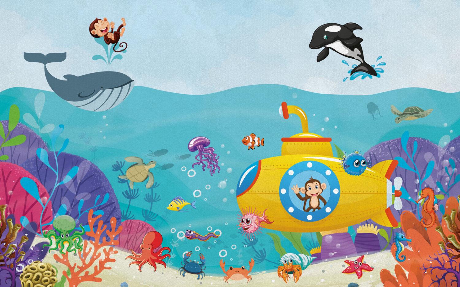 Diving Monkey And Sea Creatures Wallpaper, Whale Wallpaper for Kidsroom, Underwater Kid Wallpaper, Blue Sea Wallpaper Nursery, Child Mural