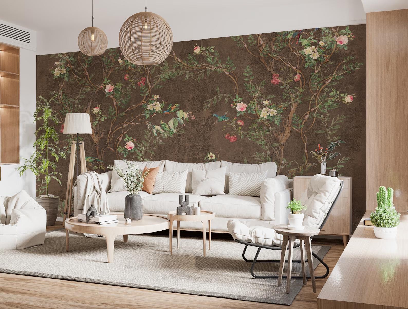 Elegant Bird and Flowers Wallpaper Brown, Spring Floral Wallpaper, Vintage Wallpaper, Romantic Mural, Bloom Wallpaper