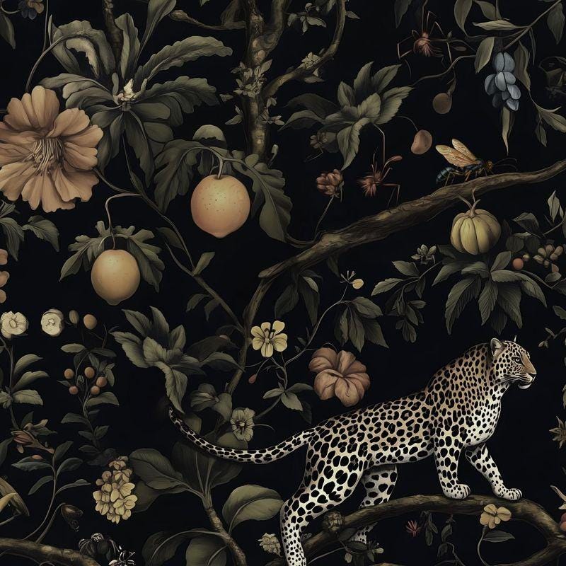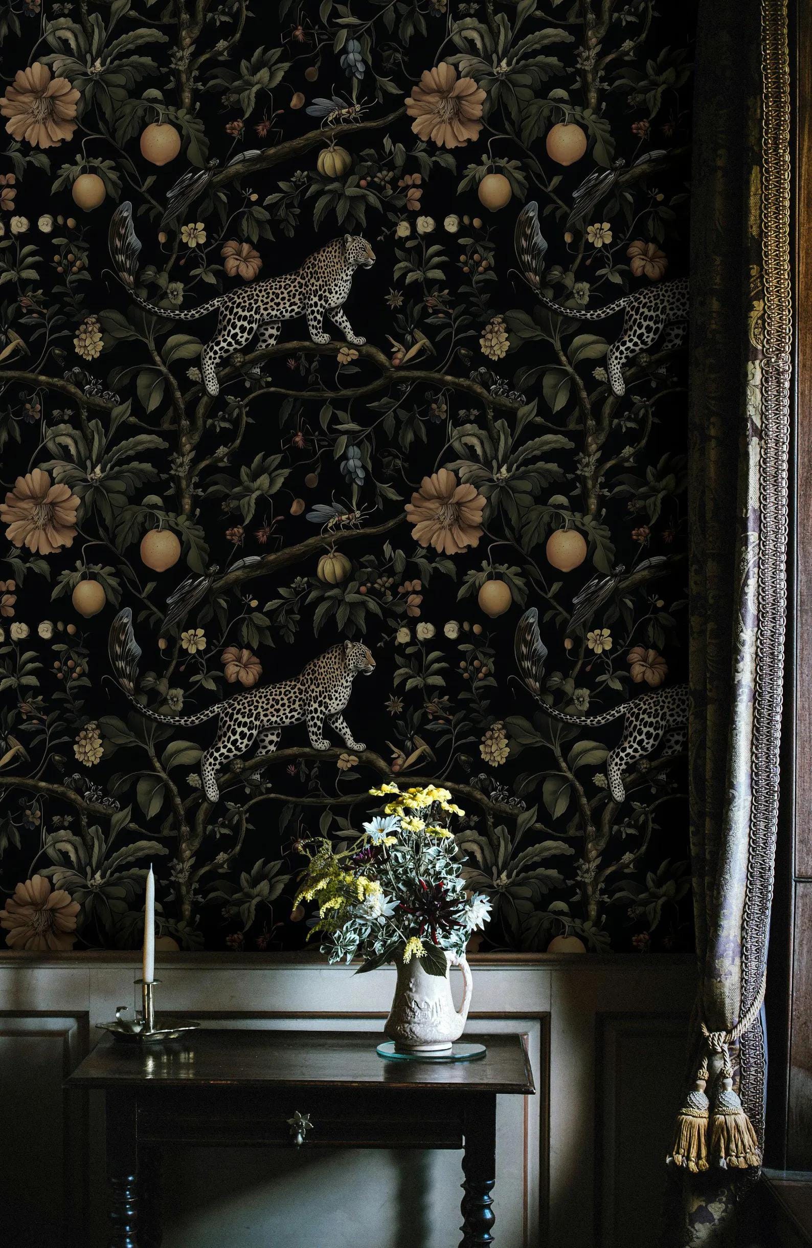 Exotic Fruits Flowers and Wild Leopard in Dark Jungle Wallpaper, Black Tropical Animal and Nature Wallpaper, Botanical and Lemon wallpaper