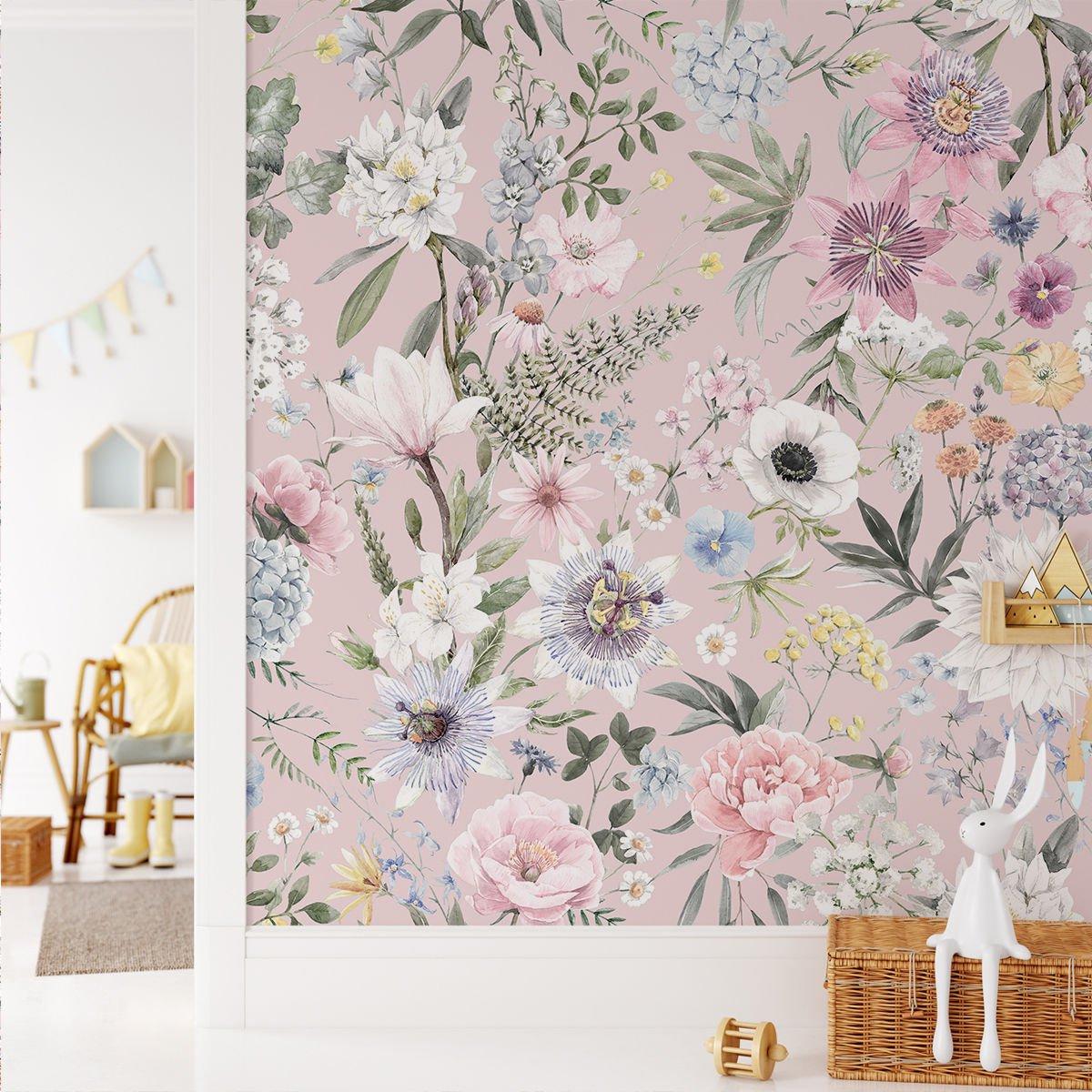Geranium Hydrangea Roses Flowers Baby Wallpaper, Flower Garden Kids Wallpaper, Spring Flowers Wallpaper Nursery, Floral Baby Girl Wallpaper