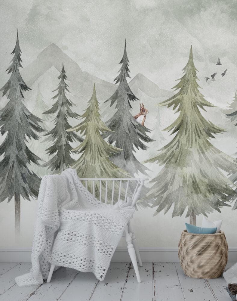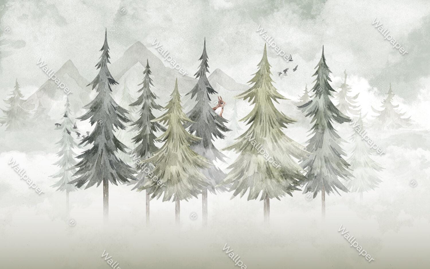 Green Pine Forest Kids Wallpaper in Soft Tones, Watercolor Nature Wallpaper For Kidsroom, Trees Wallpaper Nursery, Squirrel Baby Wallpaper