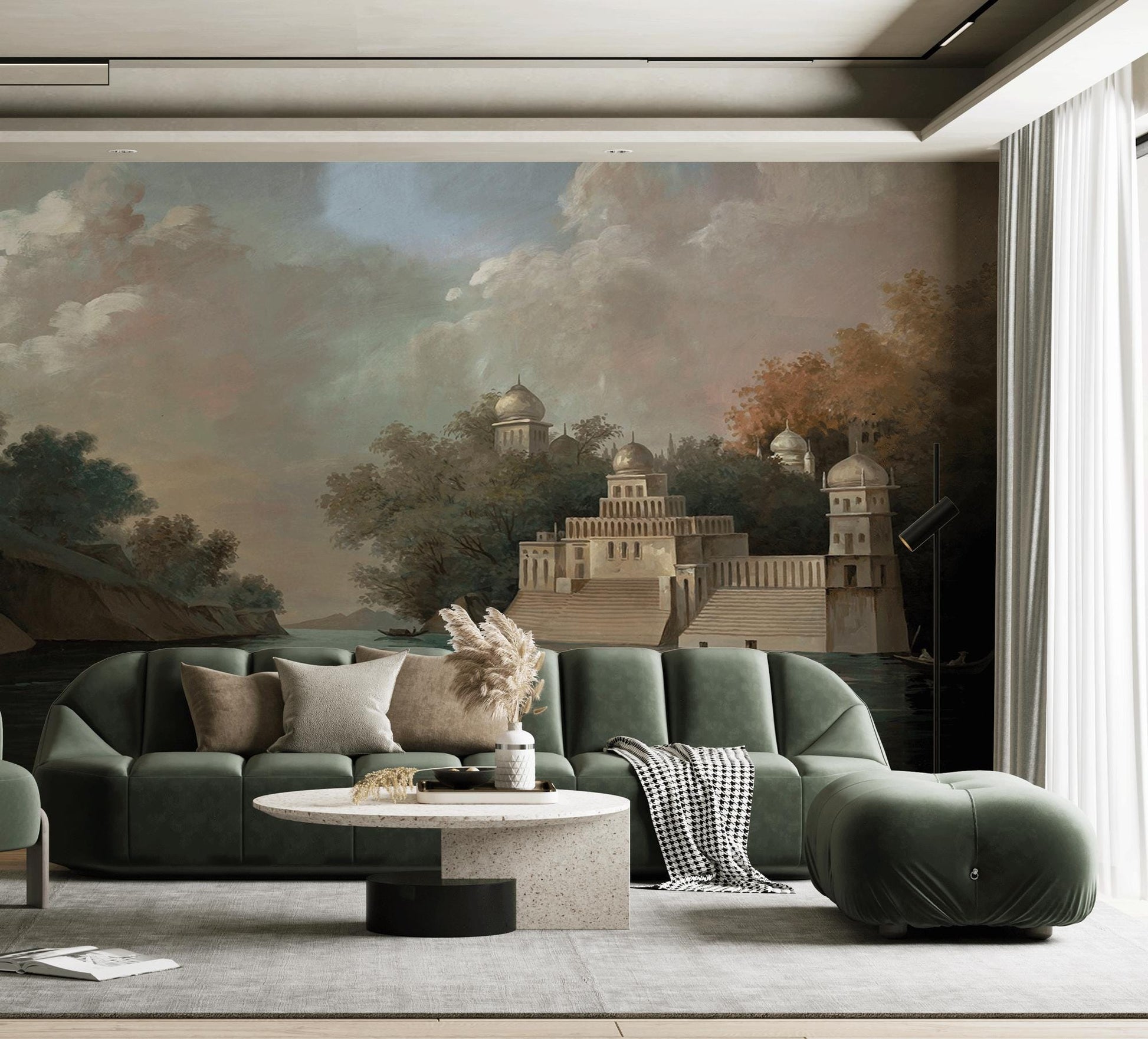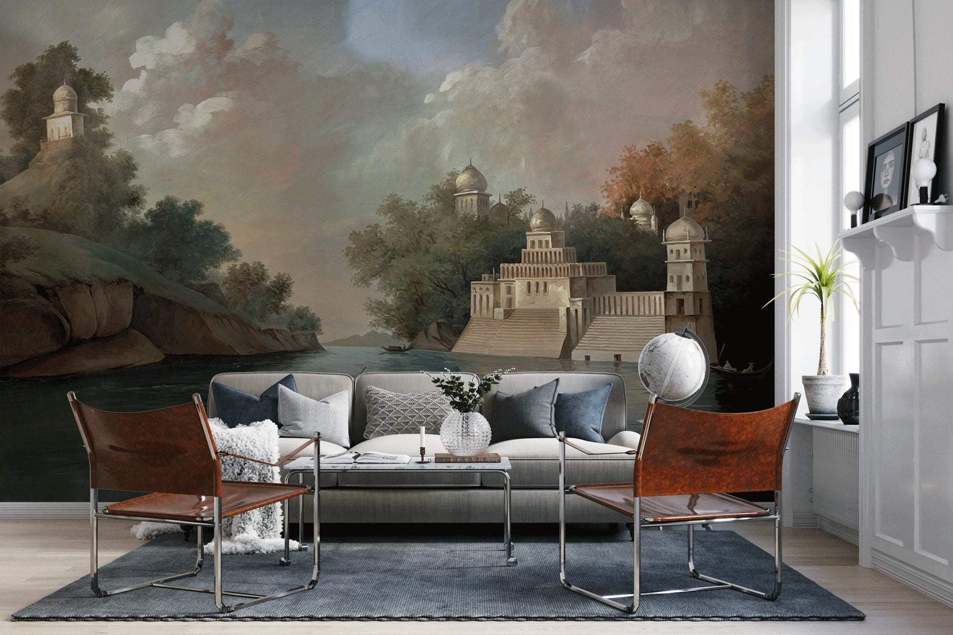 Historical Buildings by the Lake Wallpaper, Bohemian Wallpaper, Vintage Nature Wallpaper, Ancient Building Pattern Nostalgic Wallpaper