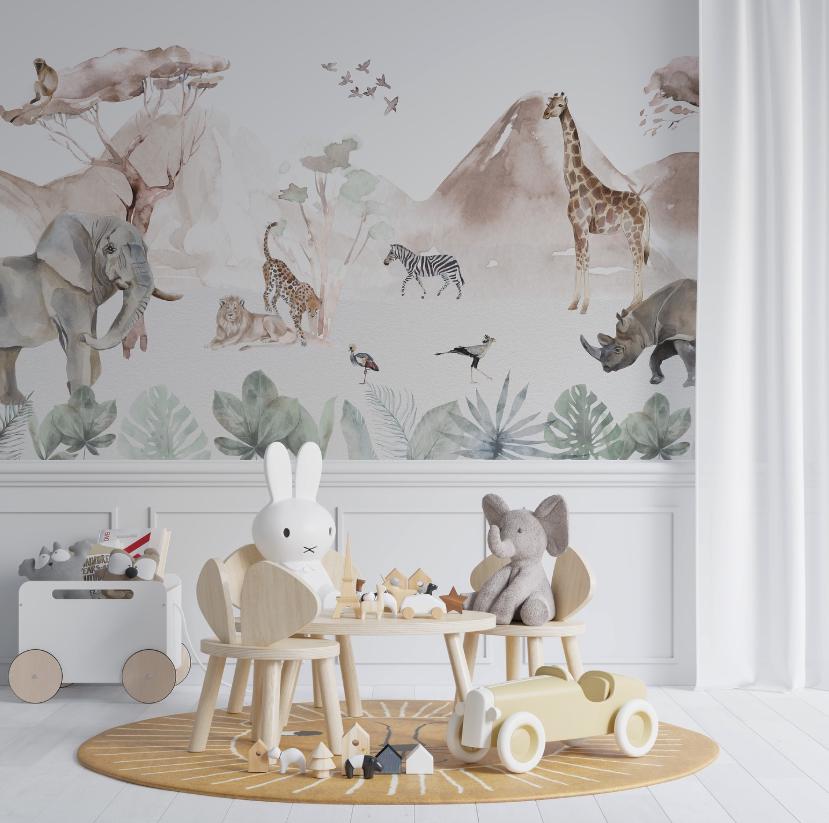 Kidsroom Art Wallpaper, Watercolor Animals Wallpaper Nursery, Nature Kids Wallpaper, Child Wallpaper, Painting Jungle Baby Wallpaper