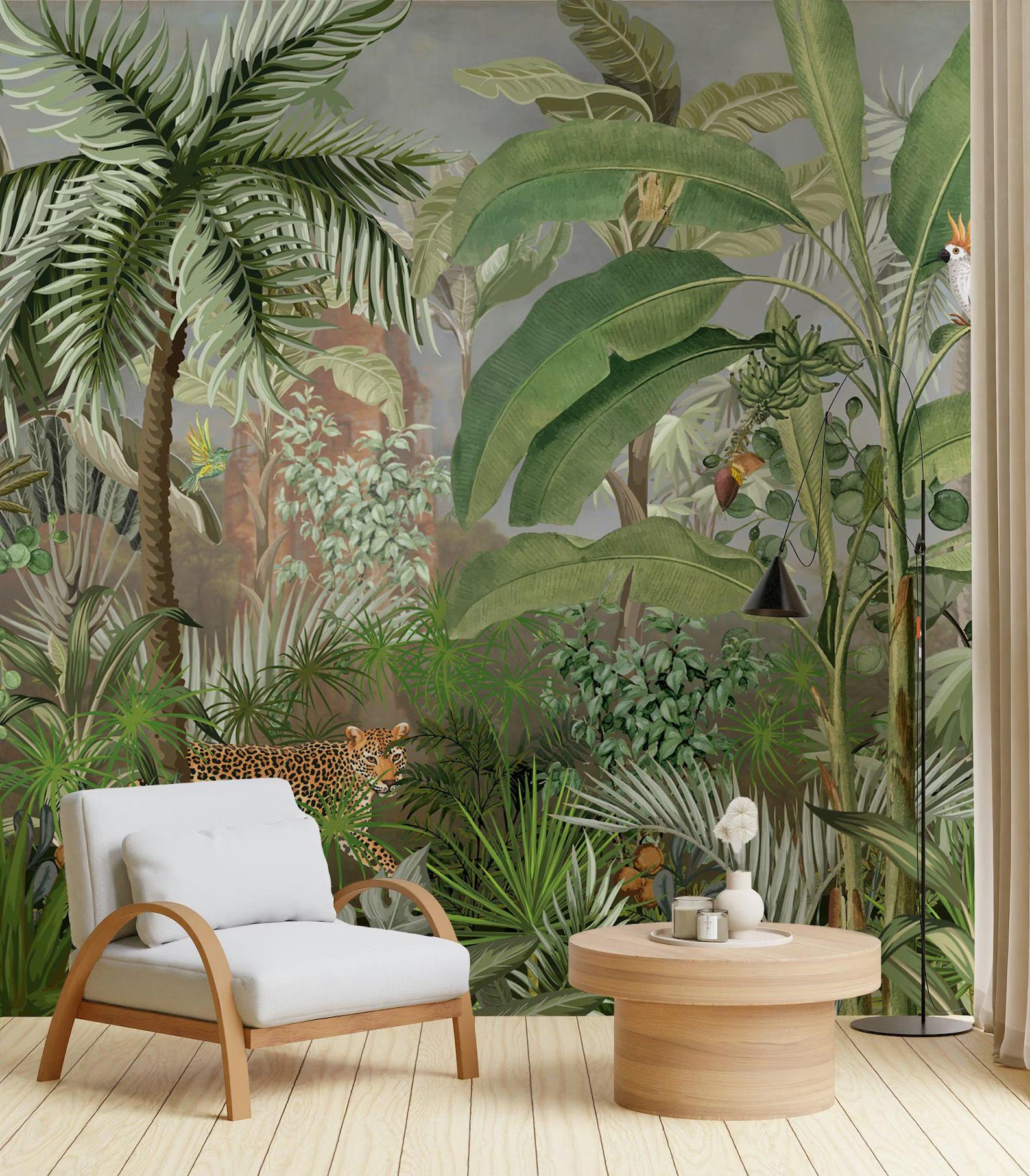 Leopard and Tropical Forest Wallpaper, Rainforest Wallpaper, Exotic Plant Floral Wallpaper, Palm Trees Bohemian Wallpaper, Wild Wallpaper