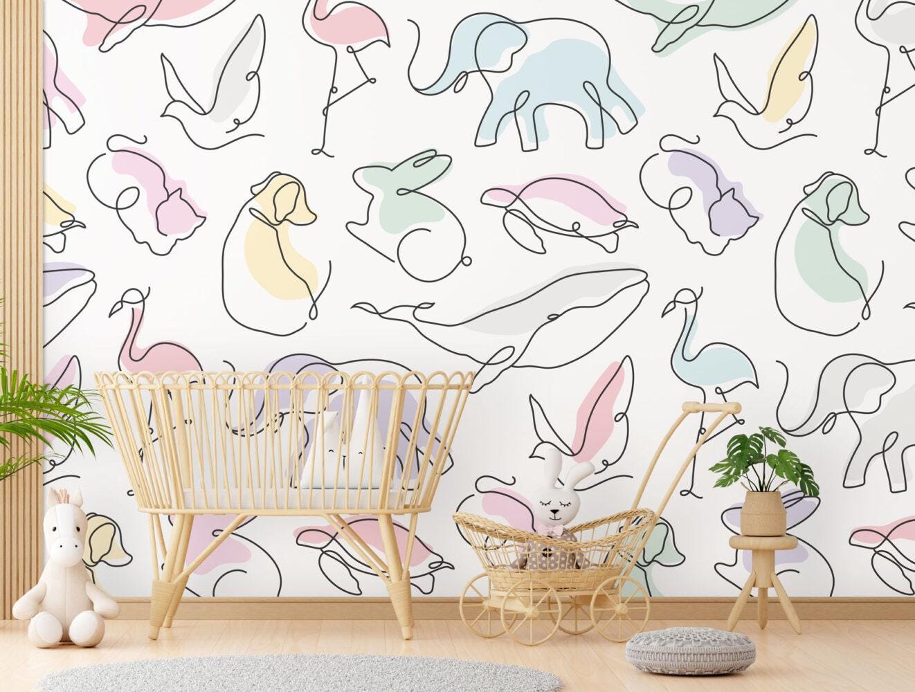Linear Animal Figures Kids Wallpaper, illustration Wallpaper Nursery, Peel and Stick Wallpaper, Watercolor Wallpaper, Fun Wallpaper for Kids