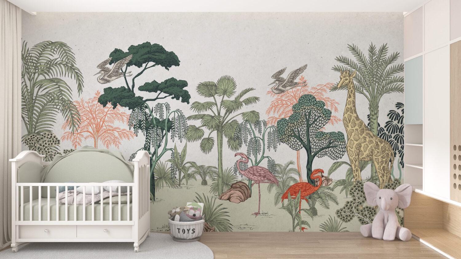 Linear Forest And Animals 3D Wallpaper For Kidsroom, Illustration Childrens Wallpaper, Wall Mural Nursery, Wide Wallpaper, Jungle Wallpaper