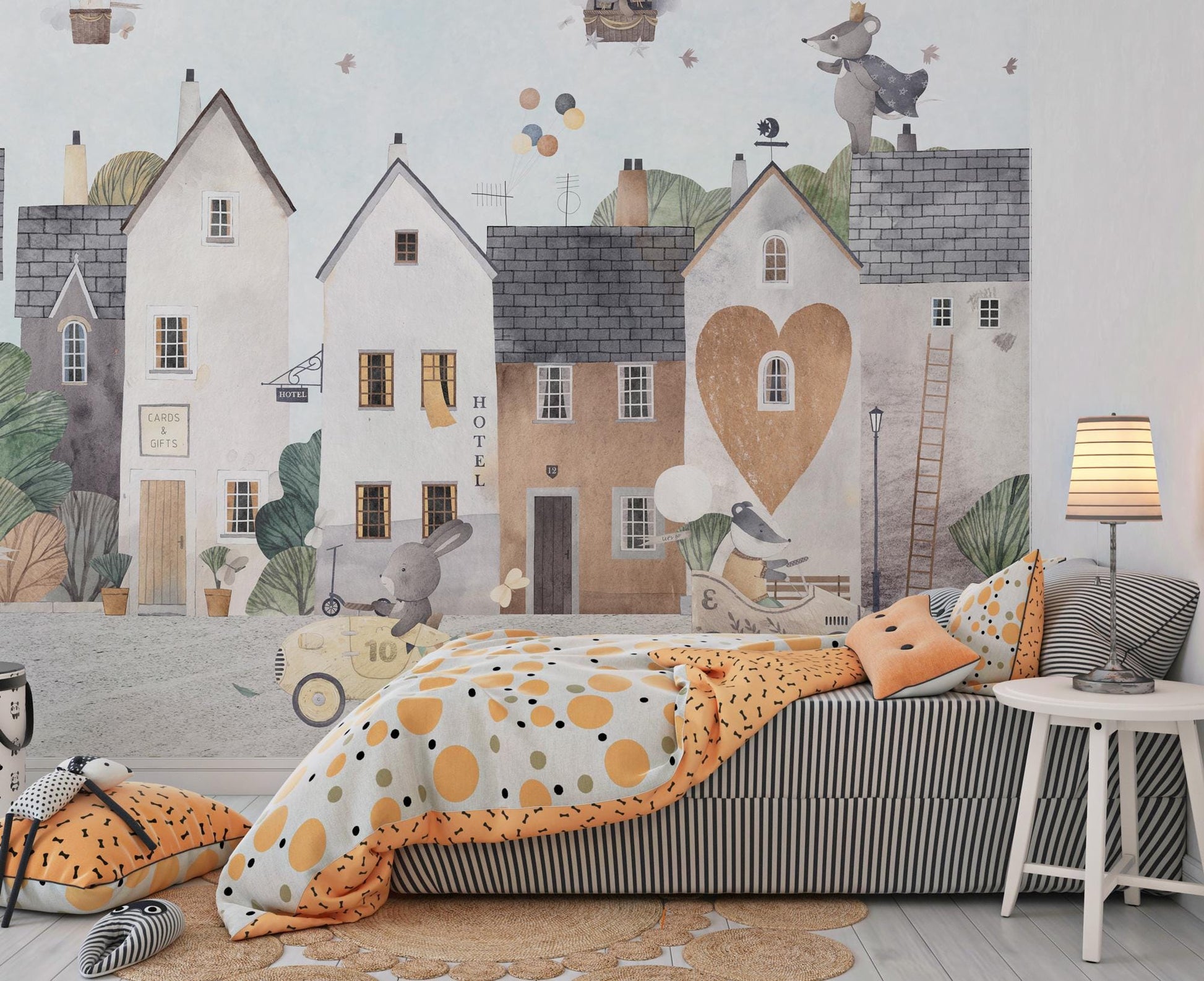 Lovely Town Wallpaper For Kidsroom, Watercolor Wallpaper Nursery, Childrens Wallpaper , Peel and Stick Wallpaper, Kids Room Design