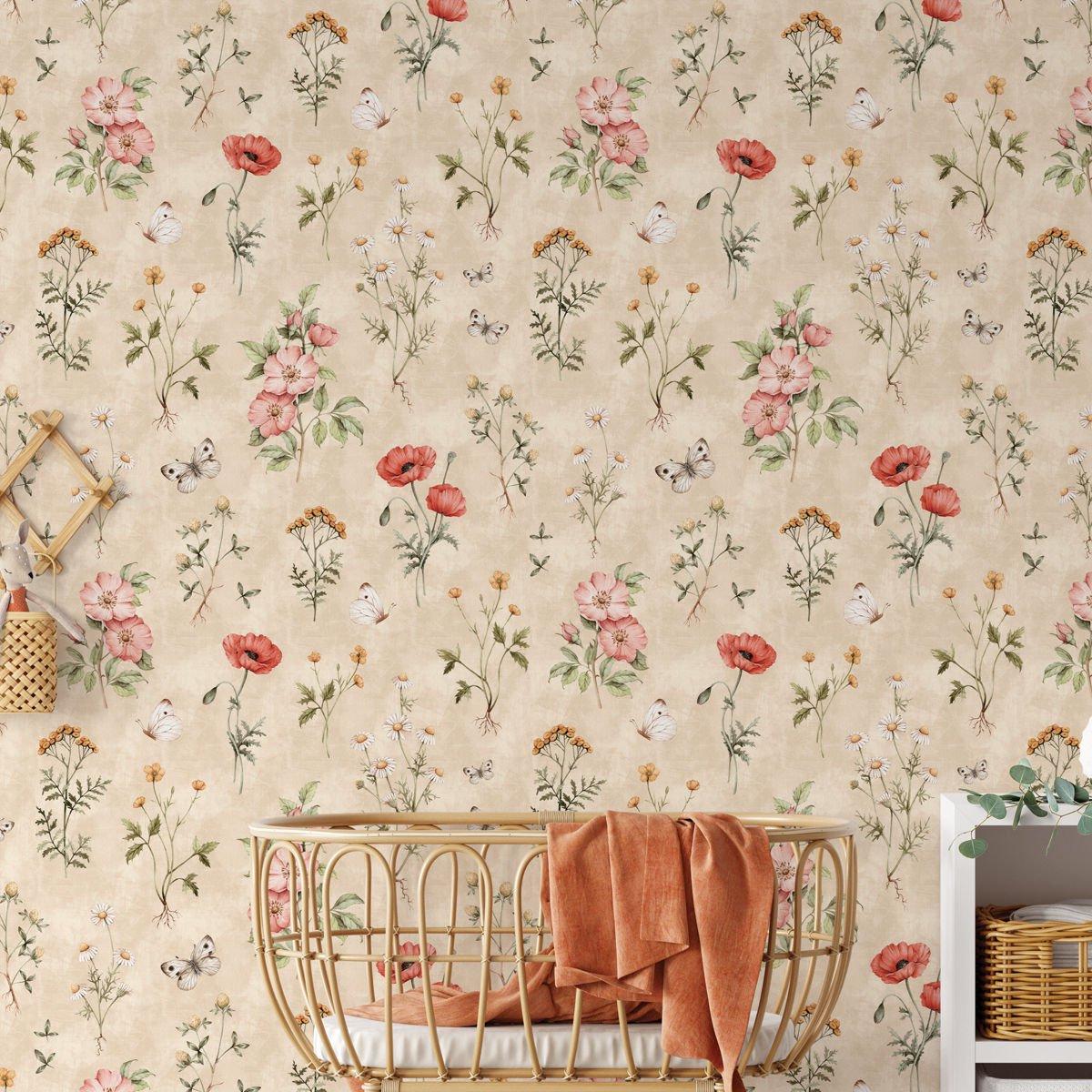 Meadow Flowers on Dark Beige Background, Flowers Baby Girl Wallpaper, Flower Garden Wallpaper, Wallpaper Nursery, Watercolor Floral Mural
