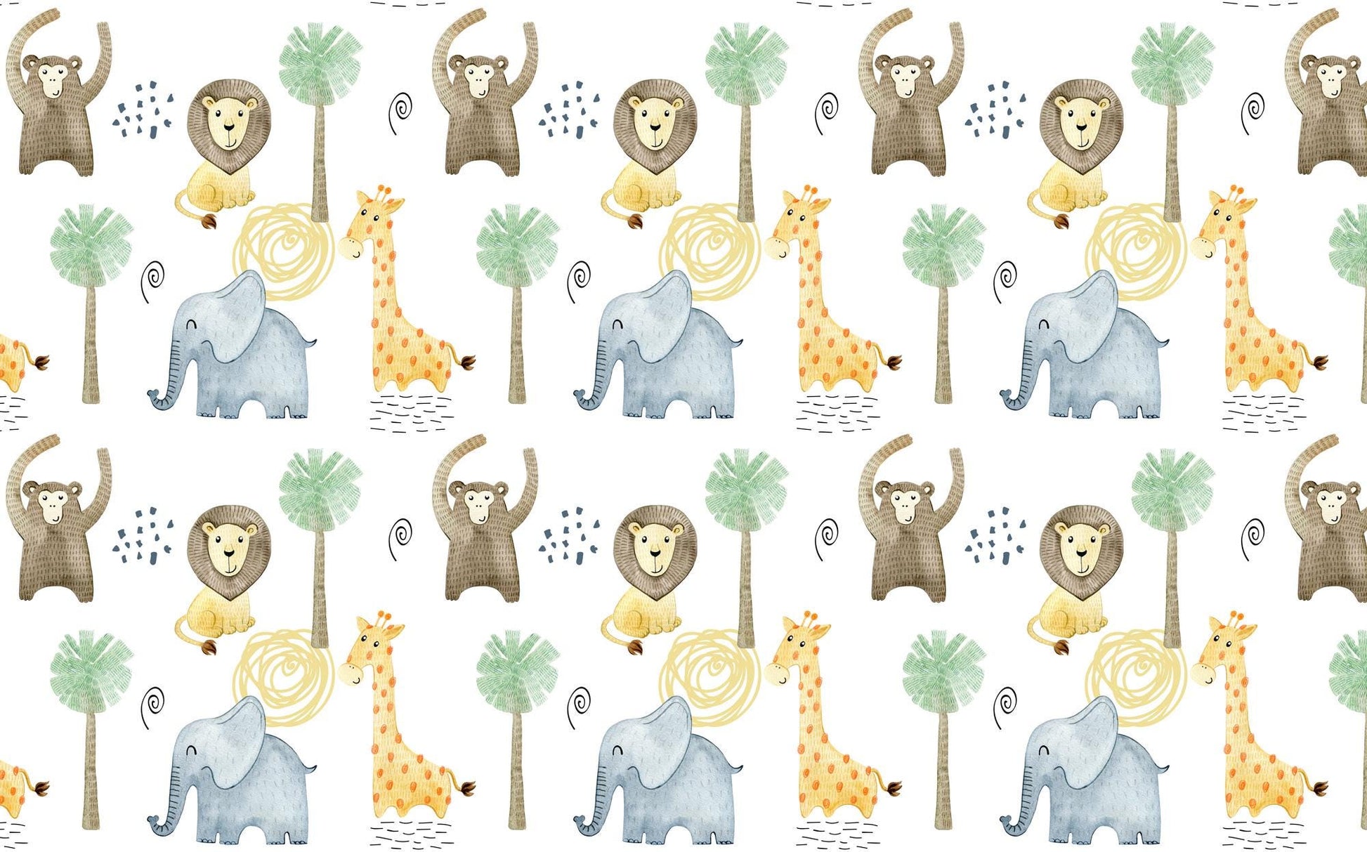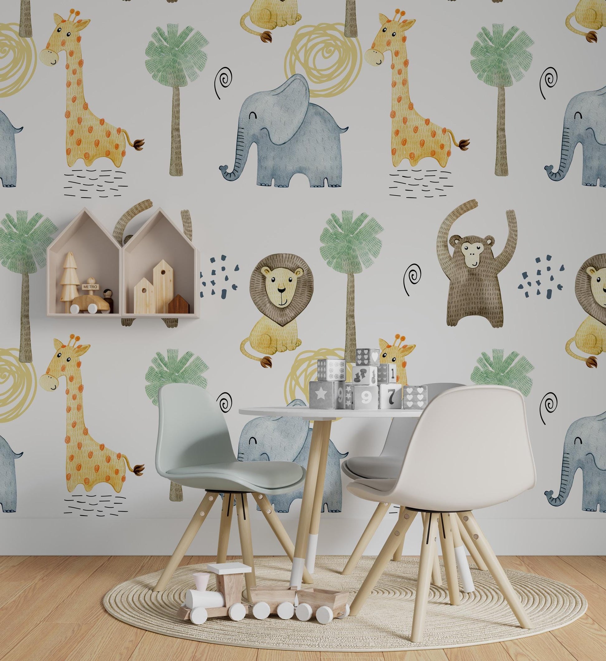 Minimalist Safari Animals Watercolor Wallpaper, Illustration Wallpaper Nursery, Art Child Wallpaper, Colorful Peel and Stick Baby Wallpaper