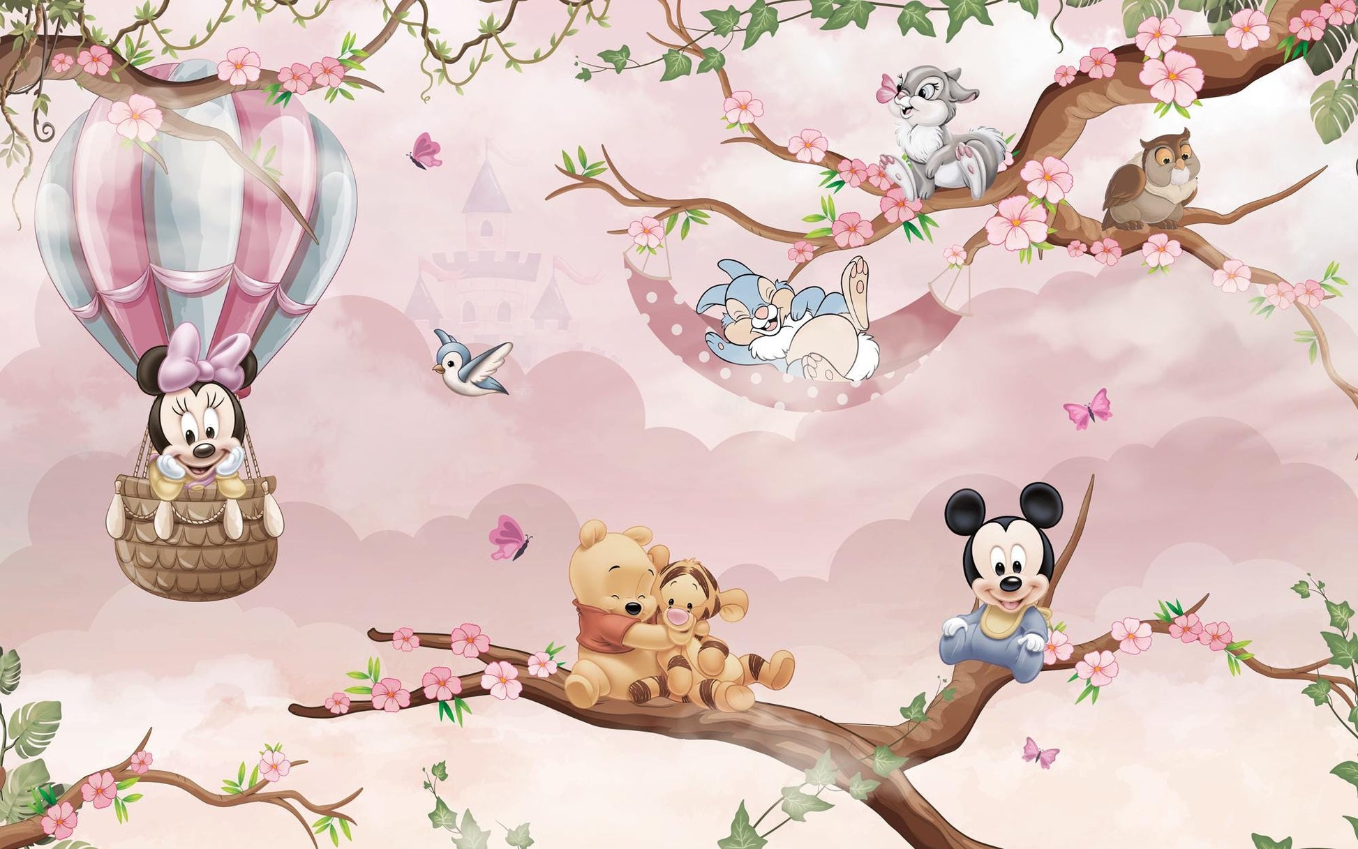 Minnie Mouse and Winnie The Pooh Wallpaper For Kidsroom, Cute Animals Wallpaper Nursery, Childrens Wallpaper, Pink Baby Girl Wallpaper