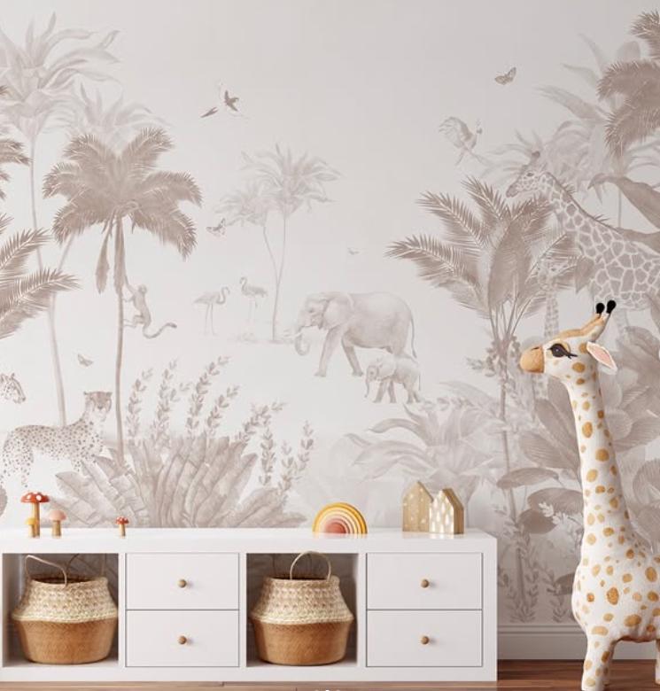 Monochrome Jungle Kidsroom Wall Poster, Soft Tones Animals Kids Wallpaper, Cute Baby Wallpaper, Drawwing Wallpaper Nursery, School Wallpaper