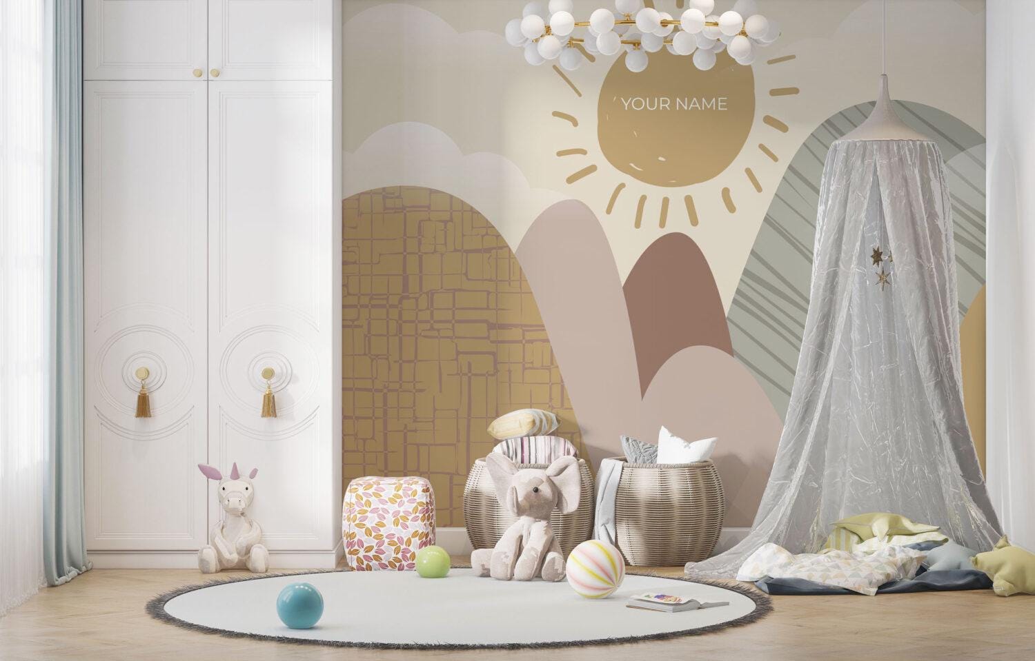 Mountain and Sun Personalized Kids Wallpaper, Illustration Wallpaper Nursery, Art Child Wallpaper, Colorful Peel and Stick Baby Wallpaper