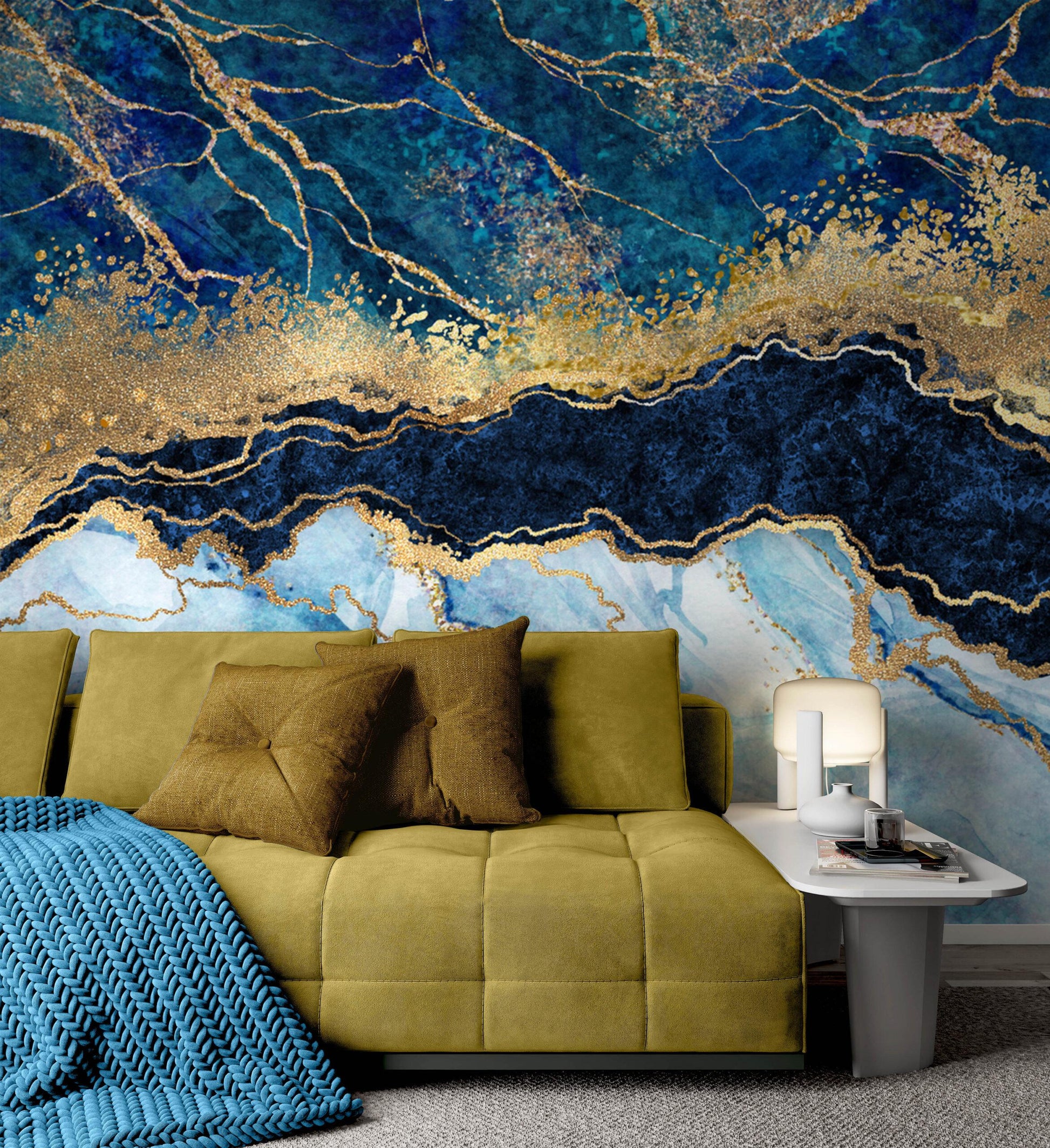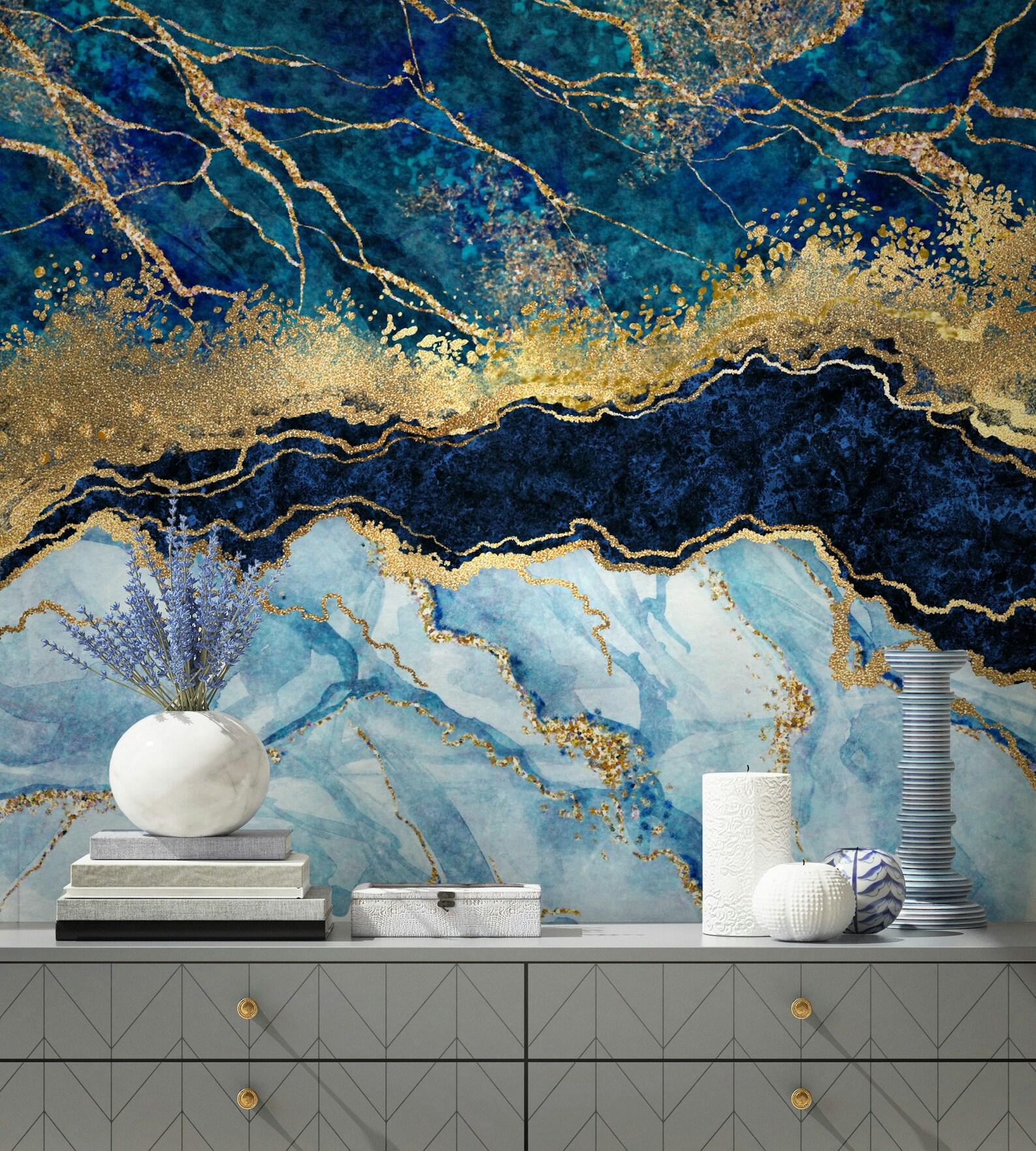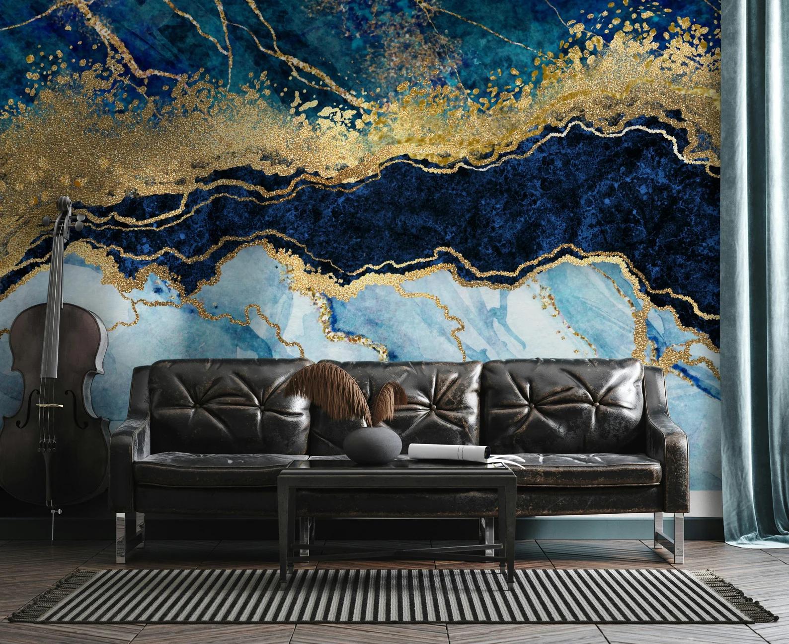 Navy Blue and Gold Marble Effect Wallpaper, Abstract Marble Texture Acrylic Paints Cool Mural, Stylish Wall Design, Modern Wallpaper