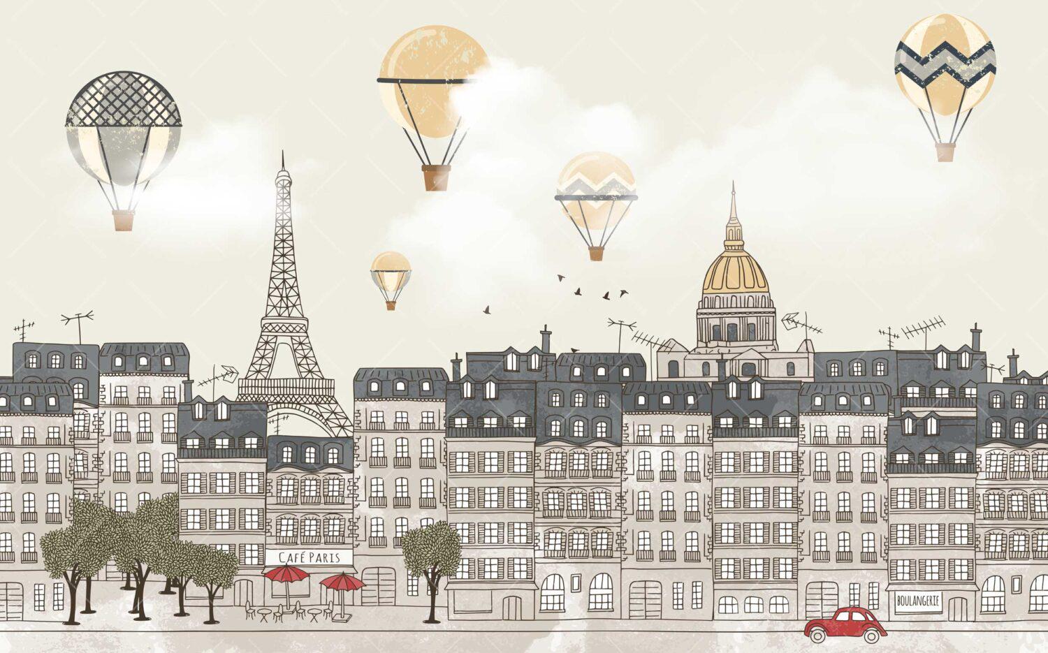 Paris City Wallpaper with Flying Balloons, Town Wallpaper For Kidsroom, Watercolor Wallpaper Nursery, Illustration Childrens Wallpaper