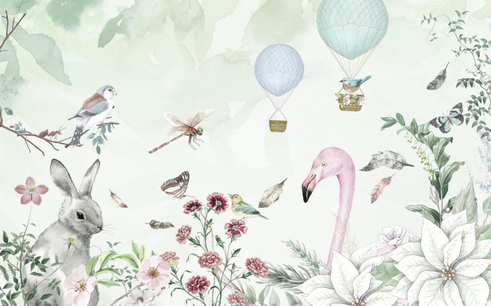 Rabbit, Bird and Flamingo Kids Wallpaper, Cute Animals Wallpaper Nursery, Child Wallpaper, Peel and Stick Wallpaper, Baby Girl Wallpaper