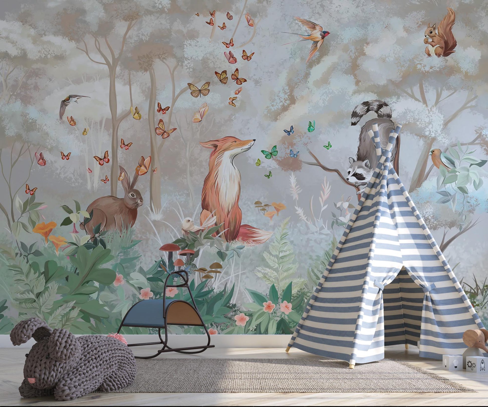 Red Fox and Forest Animals Wallpaper, Animals for Kidsroom, Children and Baby Wallpaper, Painting Wallpaper Nursery, Drawing Kids Wallpaper
