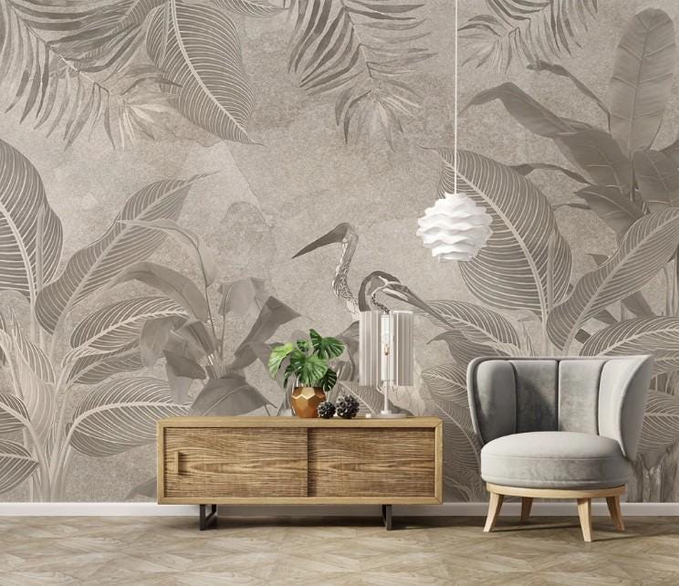 Retro Medieval Tropical Plants Wallpaper, Bohemian Peel and Stick Wallpaper, Nature Wallpaper, Nostalgic Wallpaper, Drawwing Leaf Wallpaper