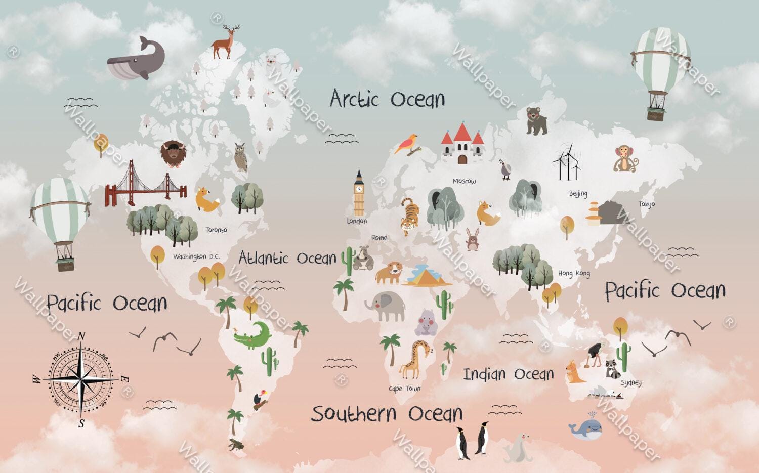 Sky Patterned Children's Map with Animals Wallpaper For Kidsroom, Children Wallpaper , Peel and Stick Wallpaper Nursery, Baby Mural