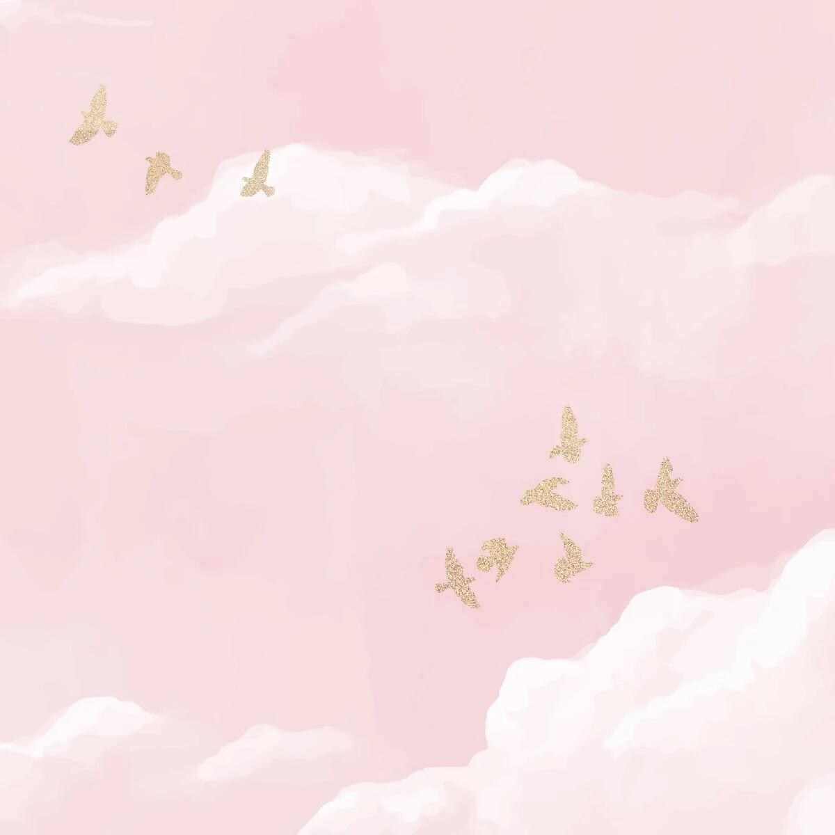 Soft Pink Sky Wallpaper, Watercolor Pink Cloud and Birds Wall Poster, Baby Girl Wallpaper, Painting Art Wallpaper Nursery