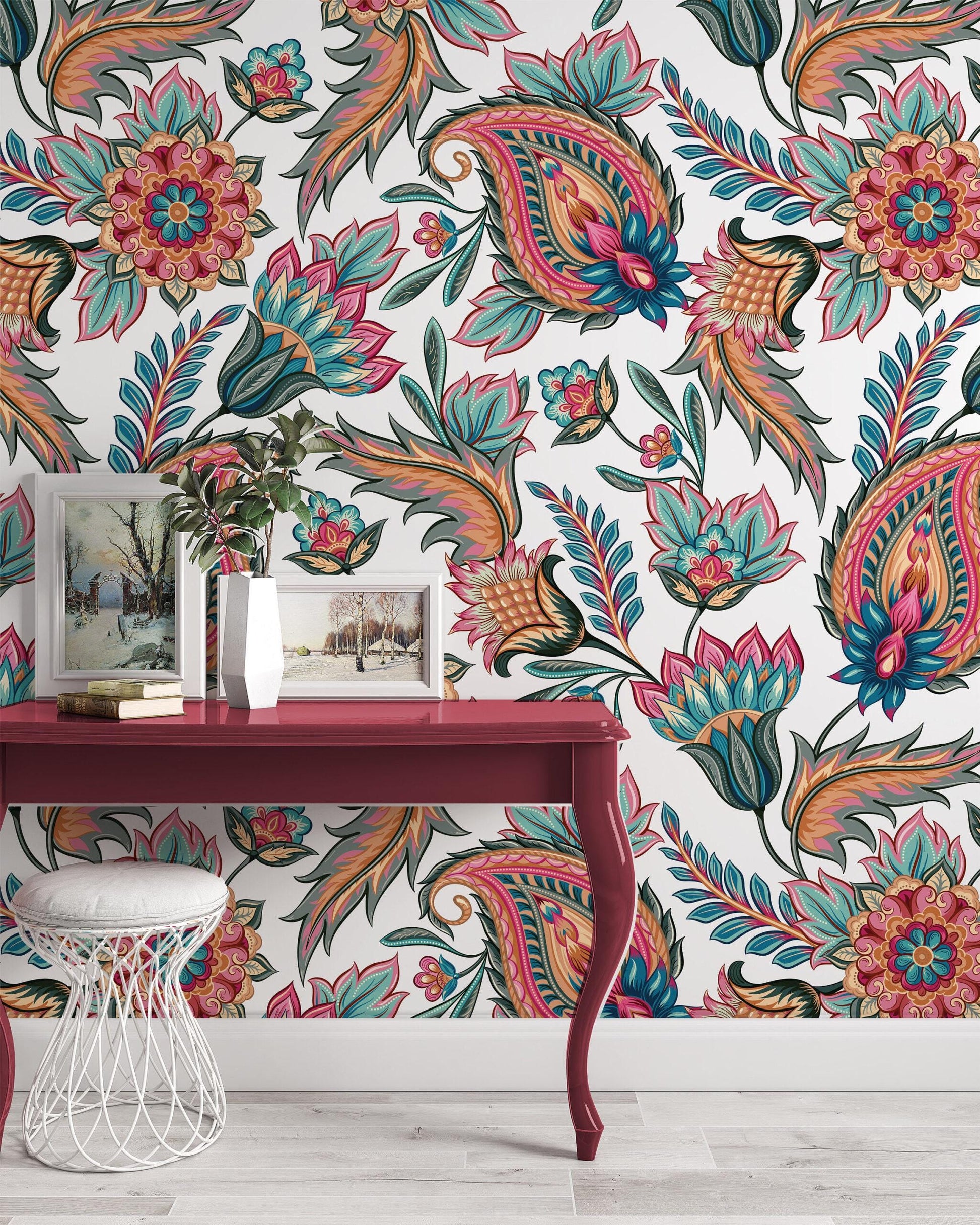 Traditional Oriental Paisley Pattern Vintage Modern Luxury Wallpaper, Spring Flowers Wallpaper, Floral Wallpaper, Romantic Drawing Mural