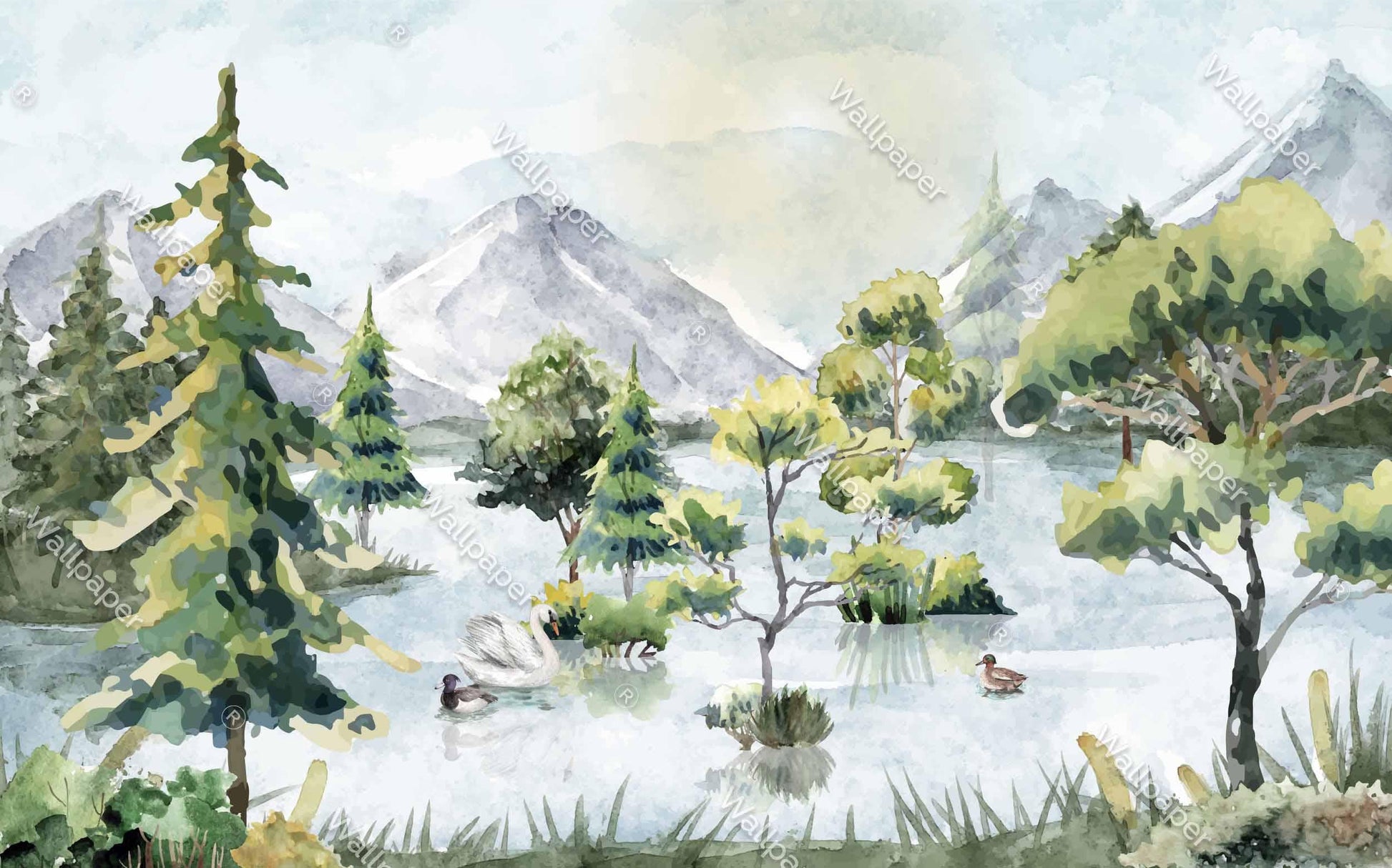 Trees By The Lake Wallpaper, Tual Wallpaper, Nature Mural, Painting Wallpaper, Peel and Stick Wallpaper, Watercolor Green and Blue Wallpaper