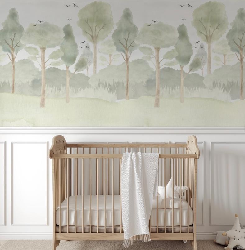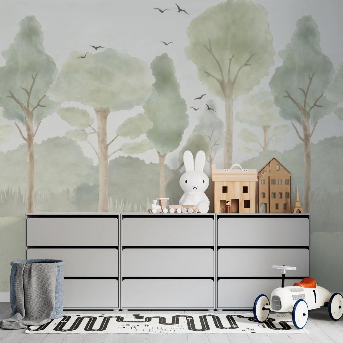 Watercolor Green Forest Wallpaper Nursery, Nature Kids Wallpaper, Forest Child Wallpaper, Drawwing Art Wallpaper, Green Baby Wallpaper
