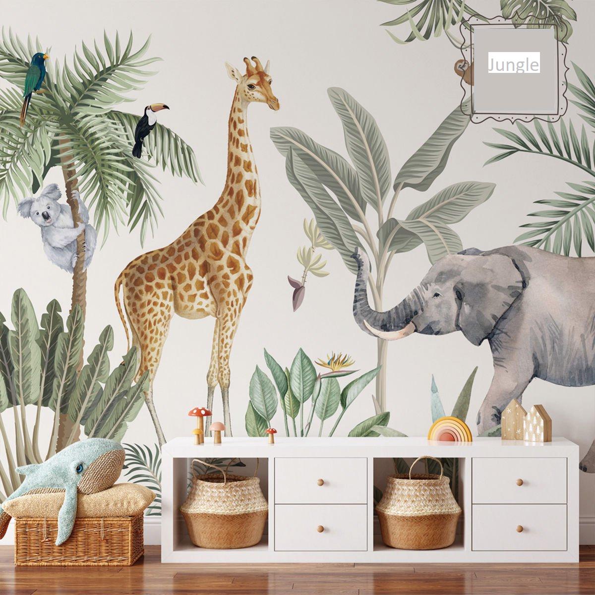 Watercolor Jungle Animals Wallpaper Nursery with Light Sky, Nature Kids Wallpaper, Forest Child Wallpaper, Drawwing Jungle Baby Wallpaper