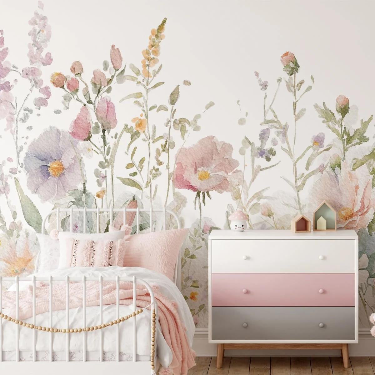 Watercolor Mixed Spring Flowers Baby Girl Wallpaper, Flower Garden Kids Wallpaper, Art Wallpaper Nursery, Watercolor Floral Wallpaper