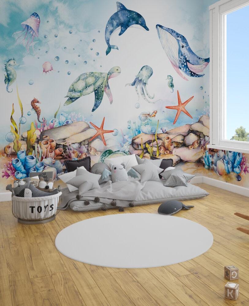 Whale and Octopus Underwater Wallpaper For Kidsroom, Sea Wallpaper Nursery, Childrens Wallpaper, Peel and Stick Wallpaper, Blue Wallpaper